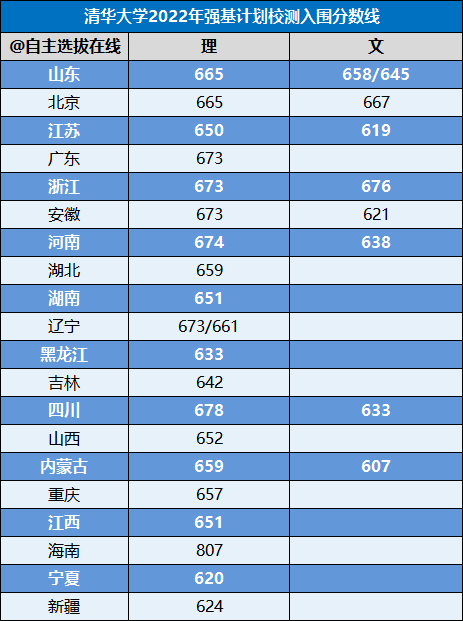 清华大学2022年强基计划入围分数线各省市汇总: