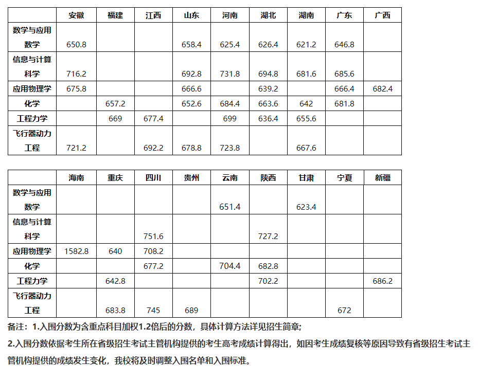 北京航空航天大学2022年强基计划第一类考生分省分专业入围分数线(单科加权后):