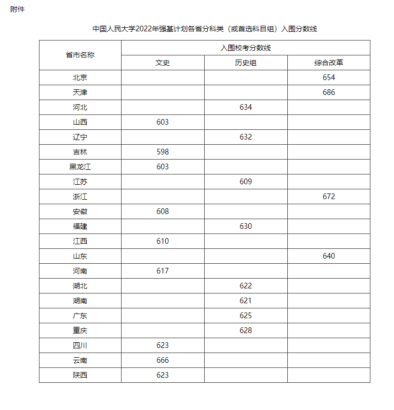 中国人民大学2022年强基计划入围分数线全国各省市汇总: