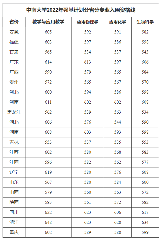 中南大学2022年强基计划入围分数线全国各省市汇总: