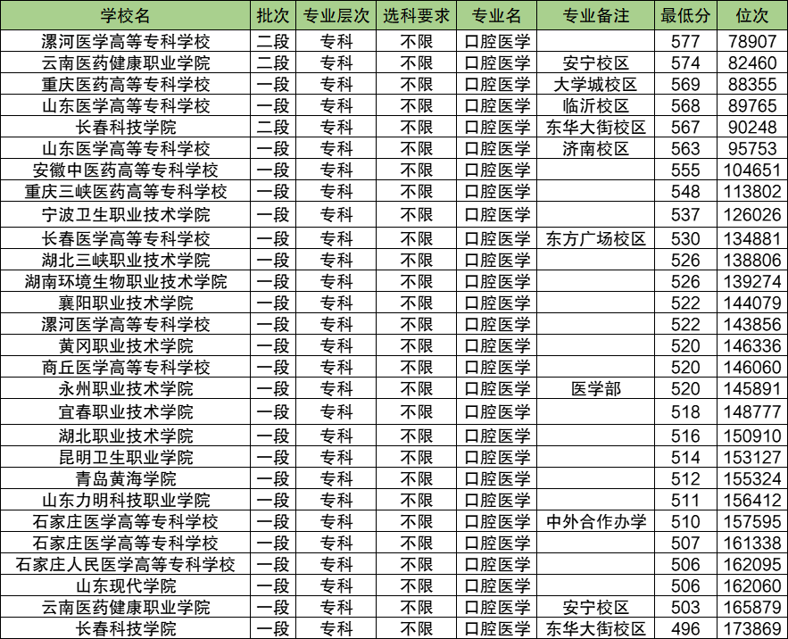 分数比较低的专科口腔医学大学有长春科技学院(最低496分)、云南医药健康职业学院(最低503分)。