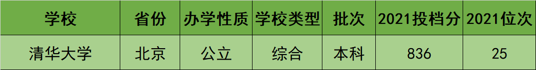根据上图可知,清华大学在2021年海南省内的最低投档分数线为836分,最低位次排名为全省第25名。所以对于想要报考清华大学的海南考生来说,建议考进海南考生中前25名,这样被清华大学录取的机会才比较大。
