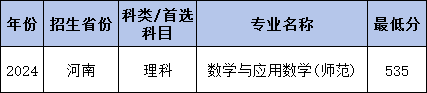 2024年南阳师范学院国家专项计划在河南录取最低分理科为535分,理科收分最低的专业为数学与应用数学(师范)。