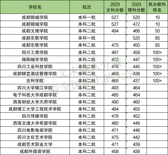 下表为四川省所有民办学校分数线及全国排名。