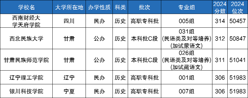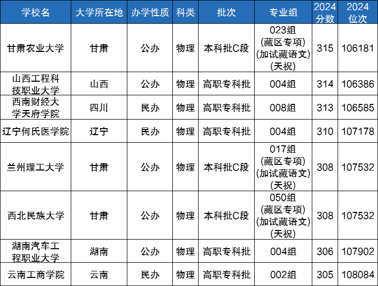 2024年甘肃省的310分左右(305-315分)能上的本科大学一共有11所,为本科批C段和高职专科批次录取的院校。