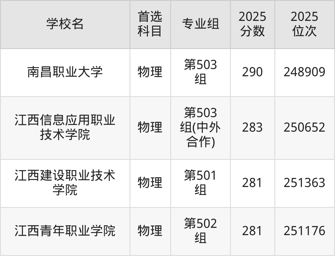 物理类/理科286分左右能够选择的院校数量有4所,含4个院校专业组。286分左右可以报考的专科大学中,公办专科大学有江西信息应用职业技术学院(第503组(中外合作)283分)、江西建设职业技术学院(第501组281分)、江西青年职业学院(第502组281分)等,注意专业组的招生类型情况,如果是单列计划(如中外合办、专项等),就不适合大部分人报考。