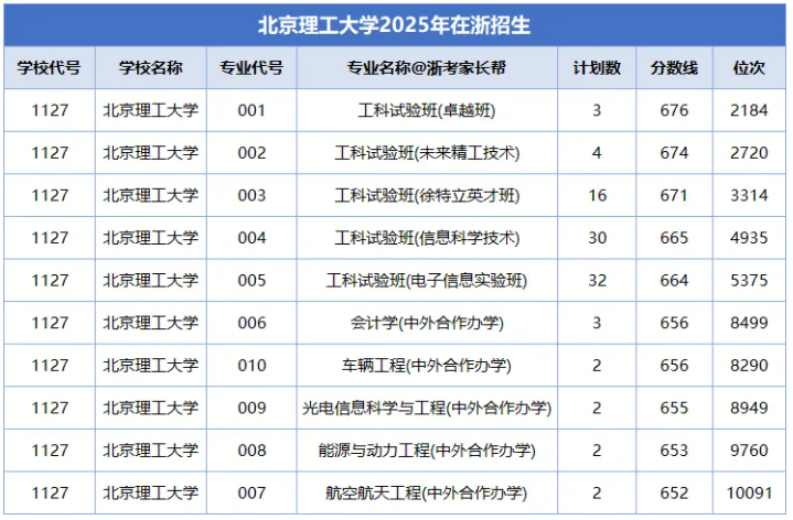 北理工在浙江收分最高的专业为工科试验班(卓越班),2025年最低分是676分、位次2184名,招生门槛很高。