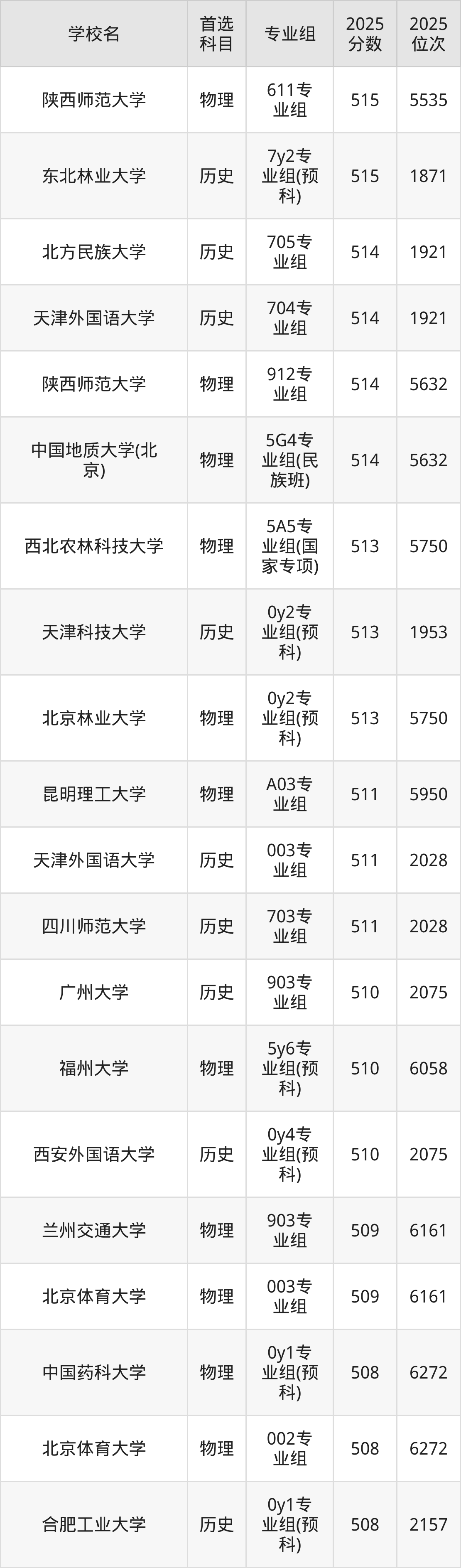 历史类510分左右能报的一本大学有16所,其中有像东北林业大学(7y2专业组(预科)515分)、合肥工业大学(0y1专业组(预科)508分)、中国矿业大学(0A2专业组(国家专项)506分)这样的211大学,可选择的院校层次还是比较高的。