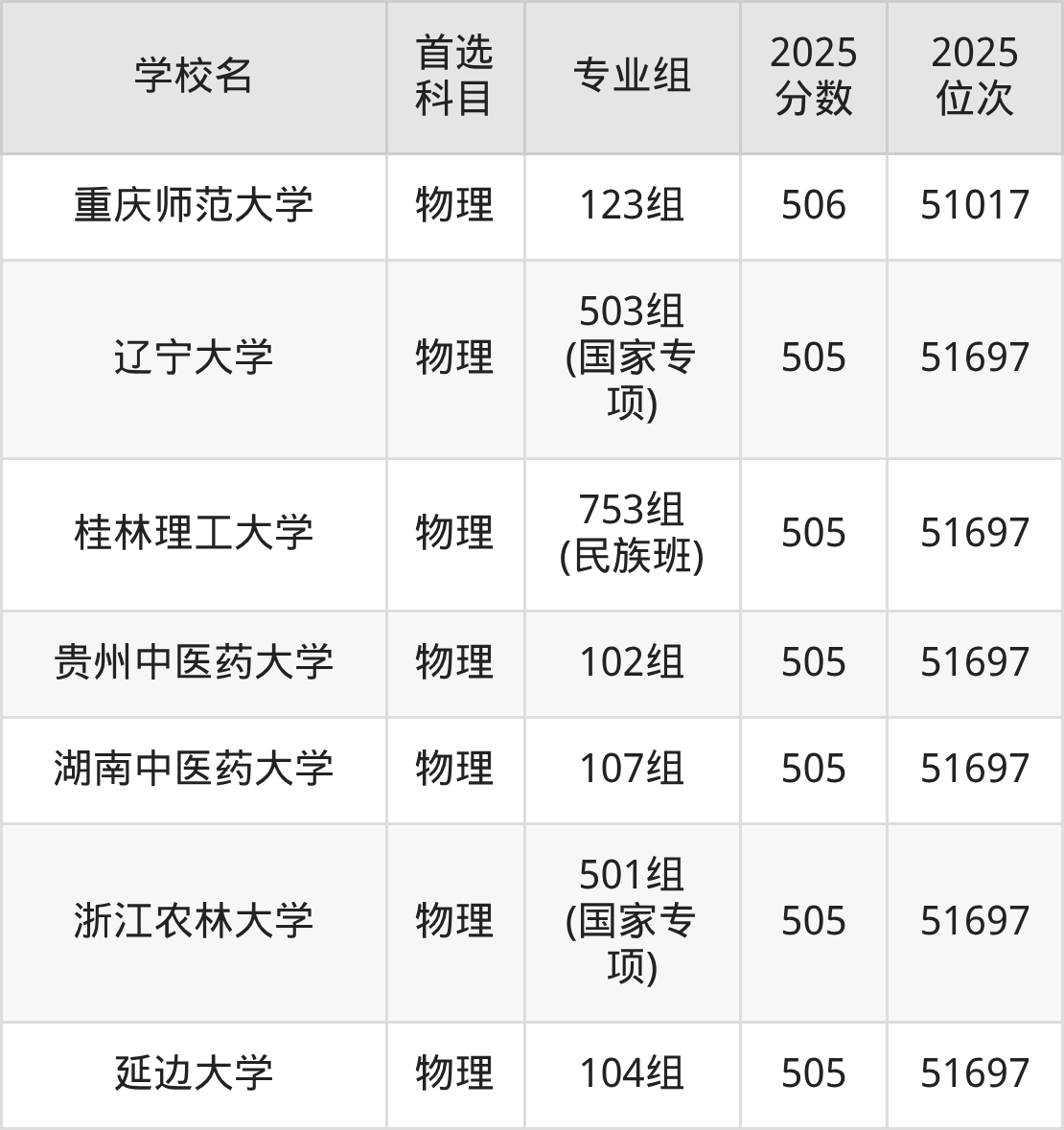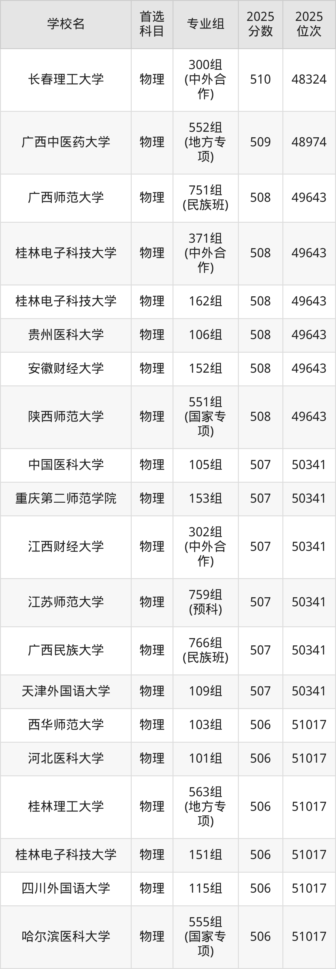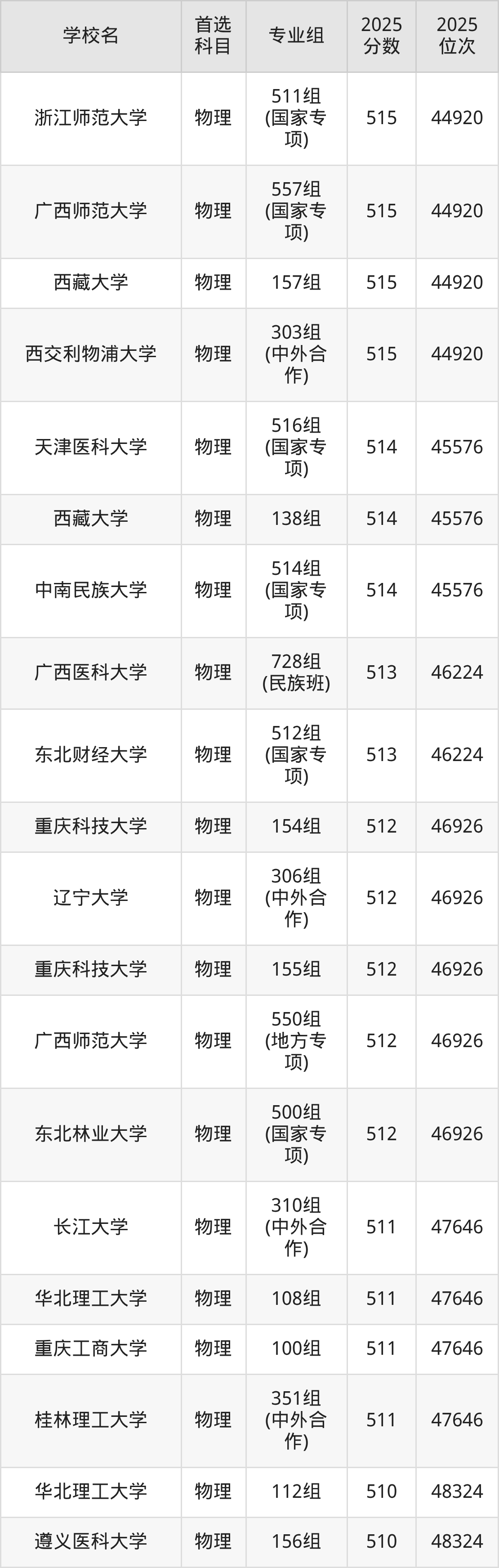 而新高考省份如果将特控线视为一本线的话,宁夏、广西、重庆、湖南等地的物理类分数均为510分以下,其中宁夏物理类特控线为441分,510分左右能上的一本学校包含北京体育大学(001专业组510分)、石家庄铁道大学(502专业组510分)、太原理工大学(501专业组510分)等。