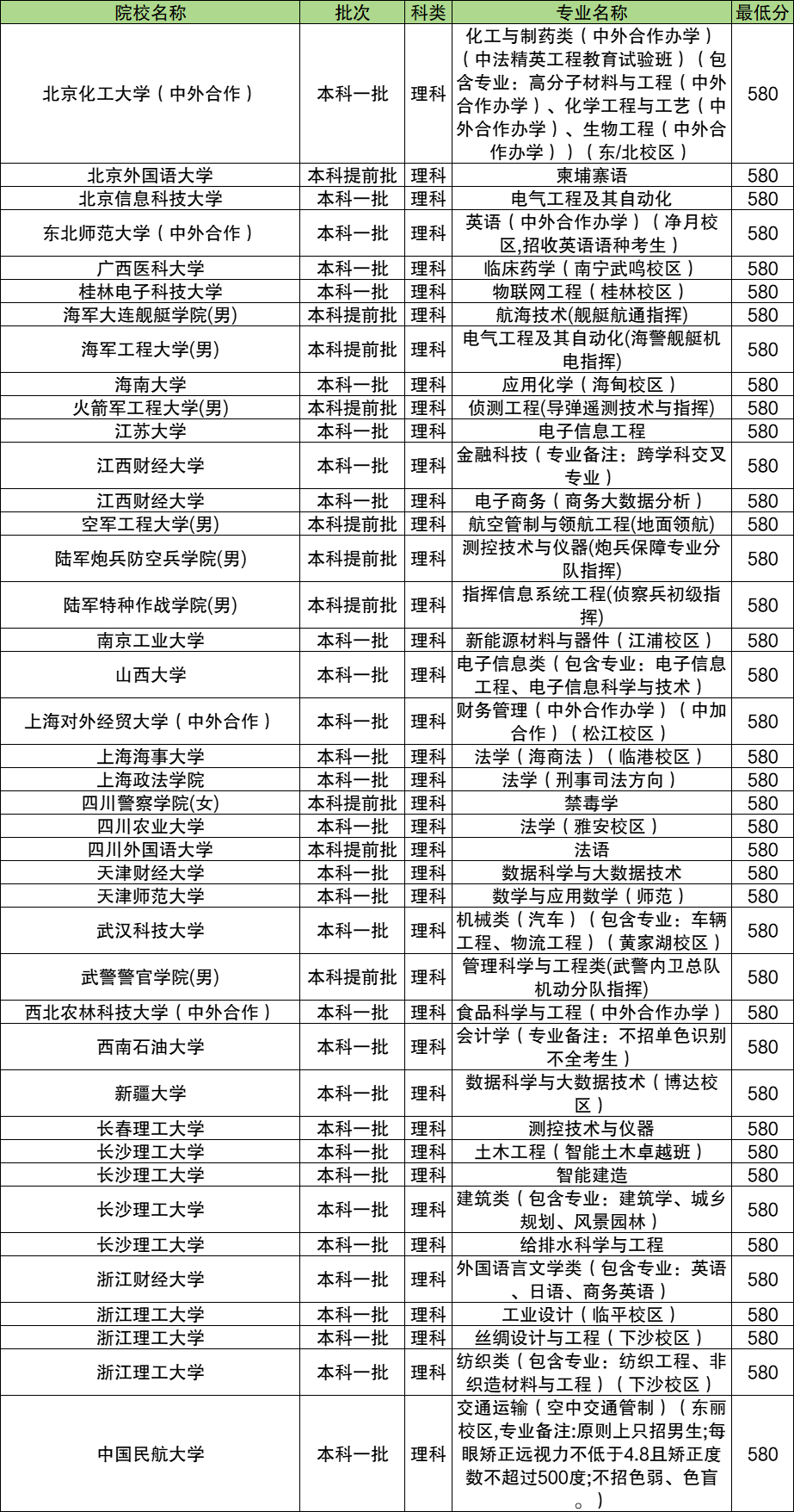从全国大学四川省高考的分数来看,580分的理科考生能报考的专业,以及对应的学校如下表: