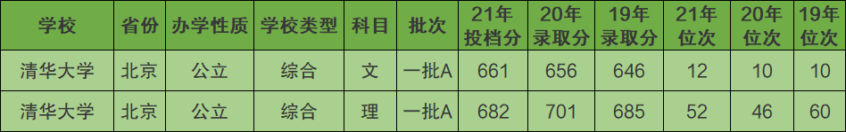 根据上图可知,黑龙江省文科生近三年分数中,清华大学最高录取分数为2021年的661分,对应黑龙江省全省位次第12名,最低为2019年的646分,对应黑龙江省高考位次第10名。