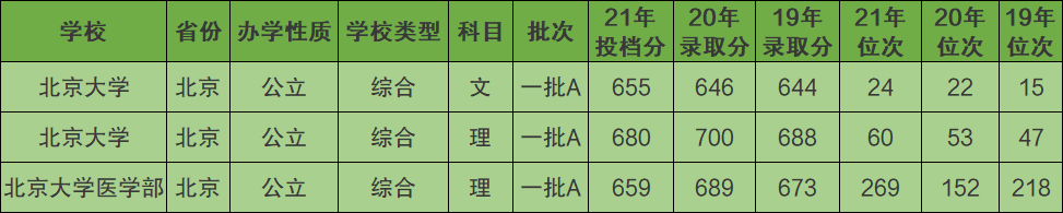 根据上图可知近三年中,北京大学在黑龙江省文科考生中的录取分数最低为2019年的644分,对应黑龙江省全省位次排名第15名, 最高为2021年的655分,对应黑龙江省高考位次第24名。