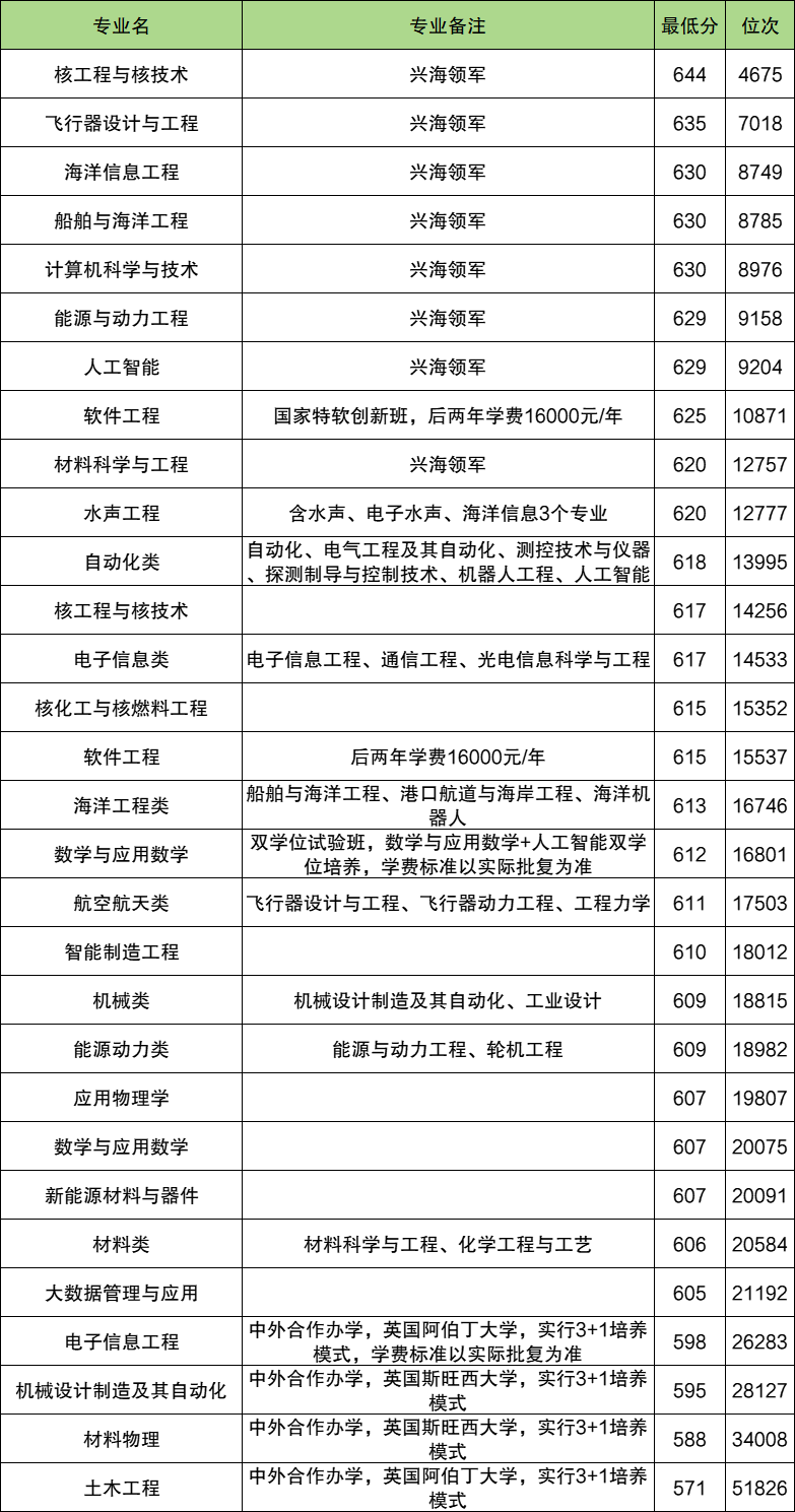 二、哈尔滨工程大学各专业最低分