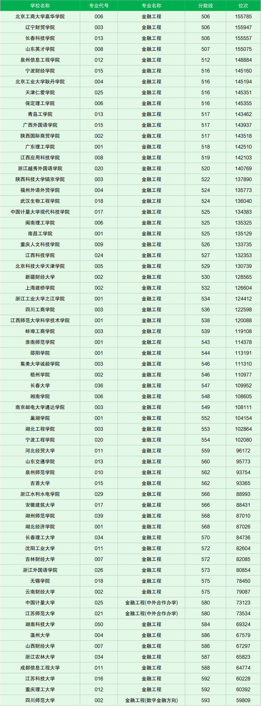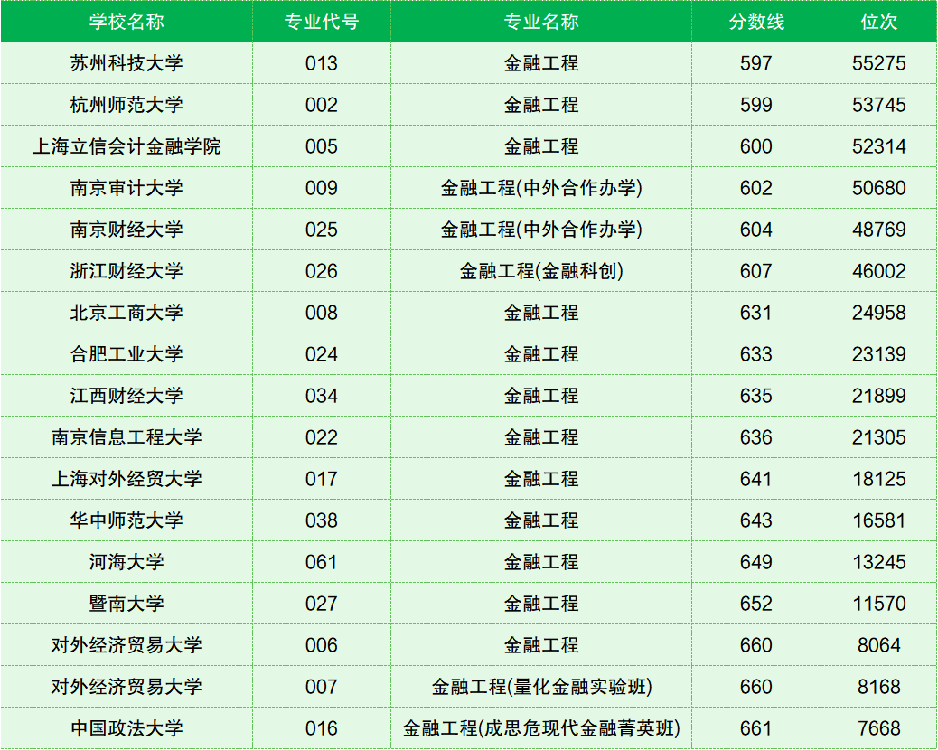 除此之外,中国计量大学和江苏师范大学的金融工程均为中外合作办学专业,分数都是580分,位次都在73000名开外。