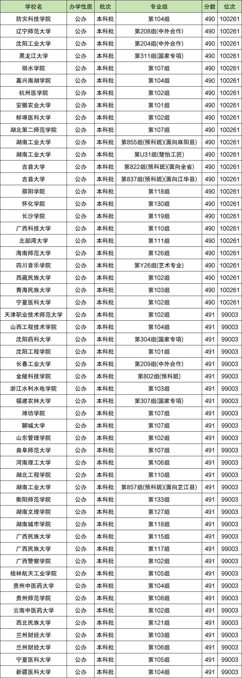 10万名左右最低位次对应的院校是防灾科技学院、辽宁师范大学、沈阳工业大学,最低录取位次为100261位,位次对应分数为490分。