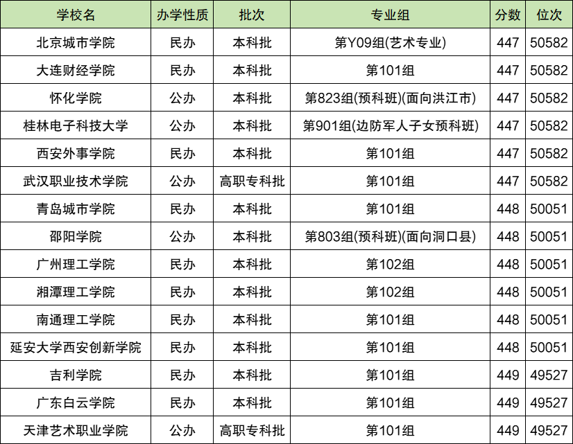 5万名左右最低位次对应的院校是北京城市学院、大连财经学院、怀化学院,最低录取位次为50582位,位次对应分数为447分。
