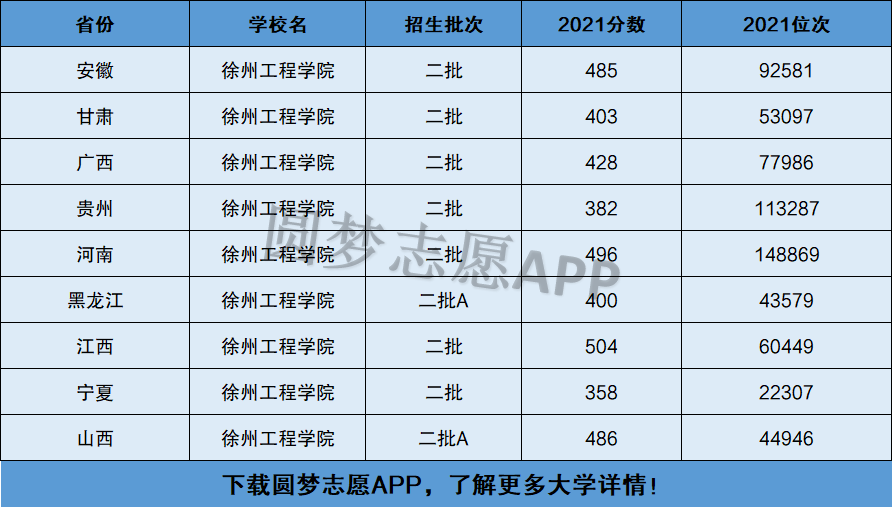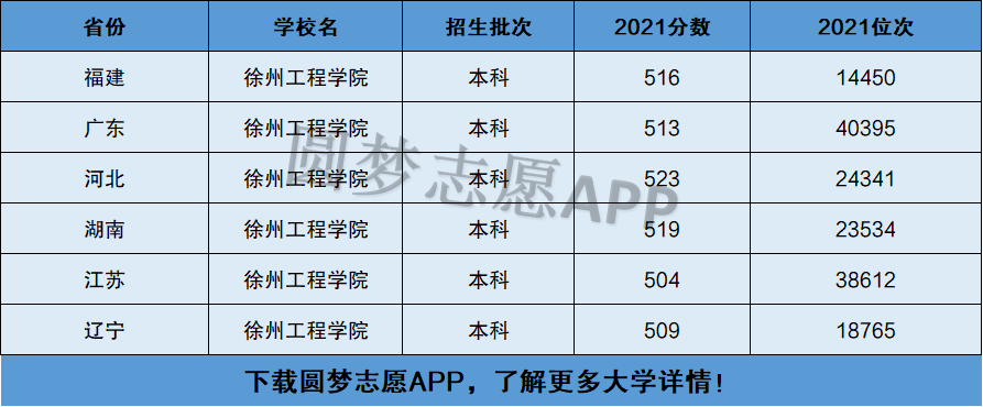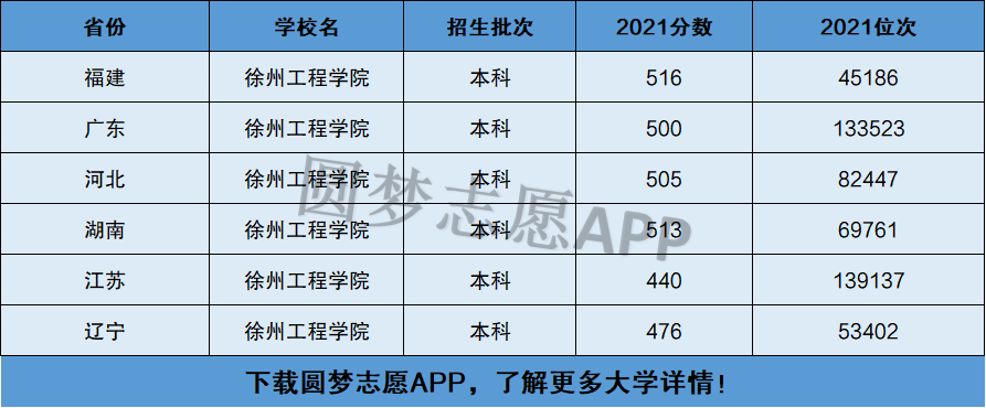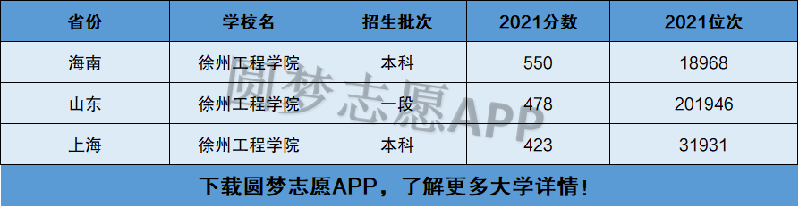 下面圆梦志愿将为大家展示徐州工程学院2021年在全国各省市的最低分数线和位次,大家可以在了解徐州工程学院在全国各省详细招生批次的同时,也顺便看看徐州工程学院的招生录取分数线是多少!