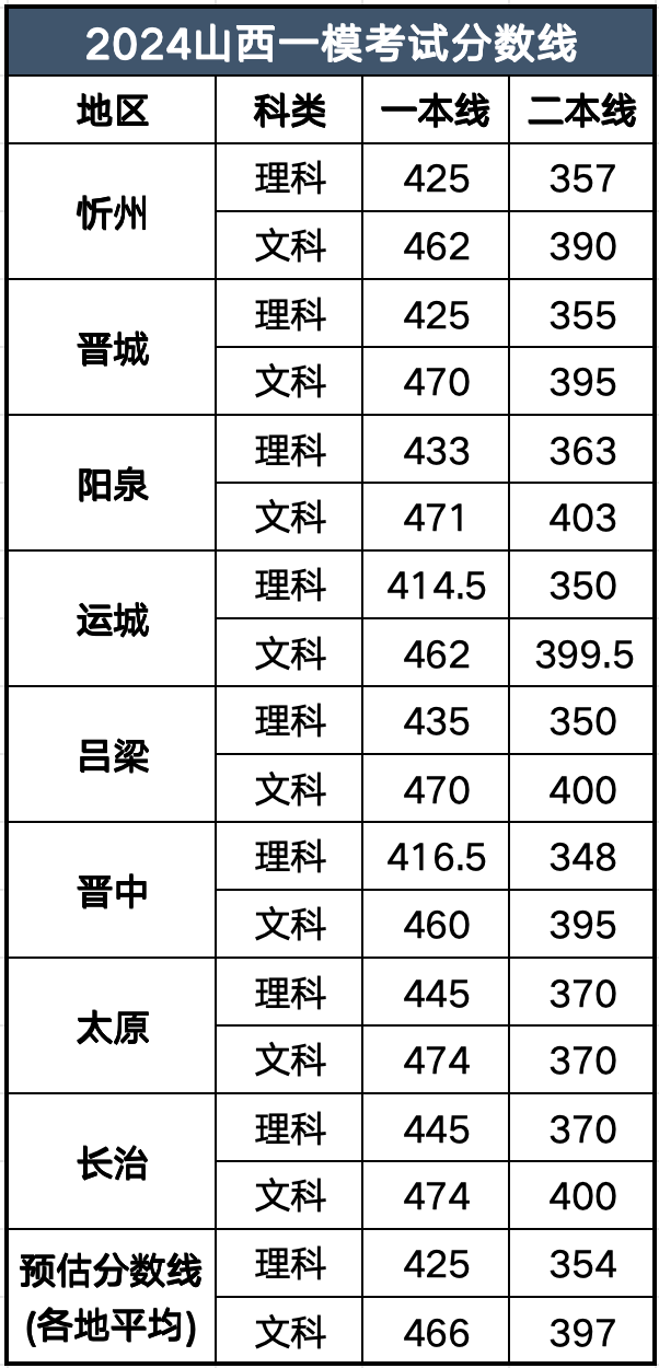2024年山西一模结束之后,各地市级的考生成绩已经陆续出炉,晋城、忻州的理科一本线均为425分,文科一本线均在460分以上。