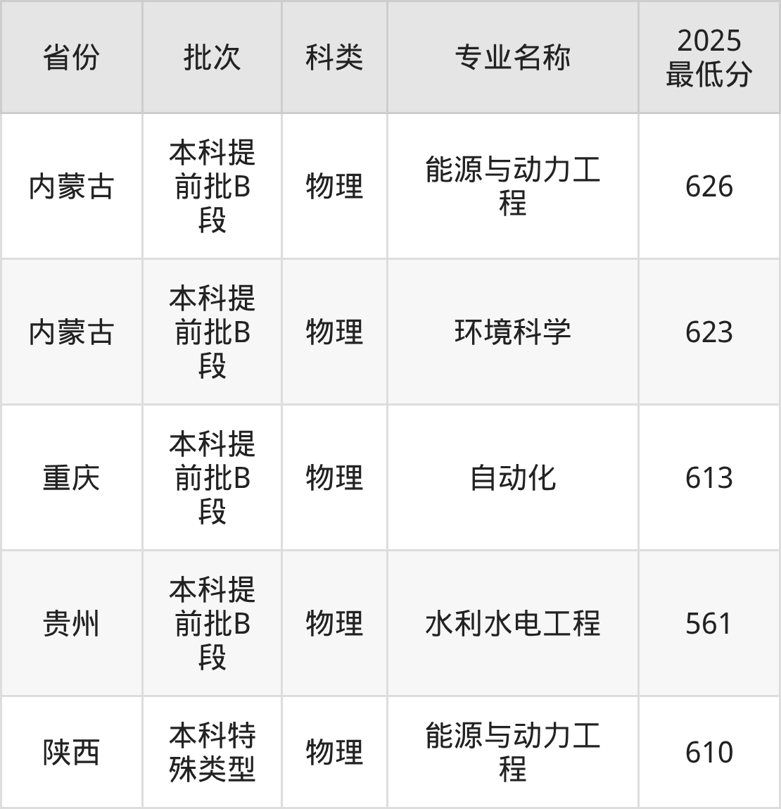 2025年华北电力大学高校专项计划招生专业包含能源与动力工程、环境科学、测控技术与仪器、自动化、水利水电工程。各专业最低录取分数线如下: