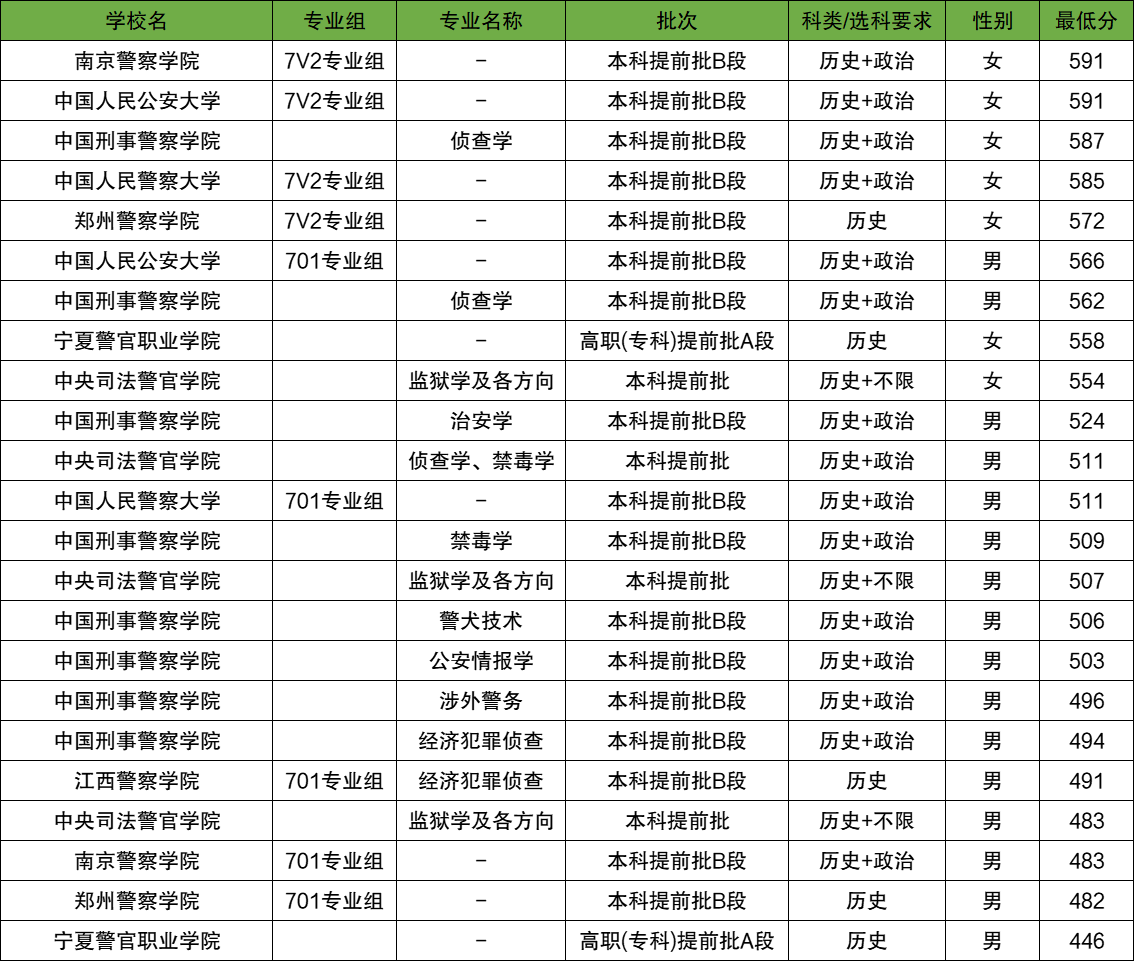2025年宁夏警校历史类录取分数线在446分-591分之间,录取分数线最高的是南京警察学院,2025年最高投档线为591分;录取分数线最低的是宁夏警官职业学院,2025年最低投档线为446分。