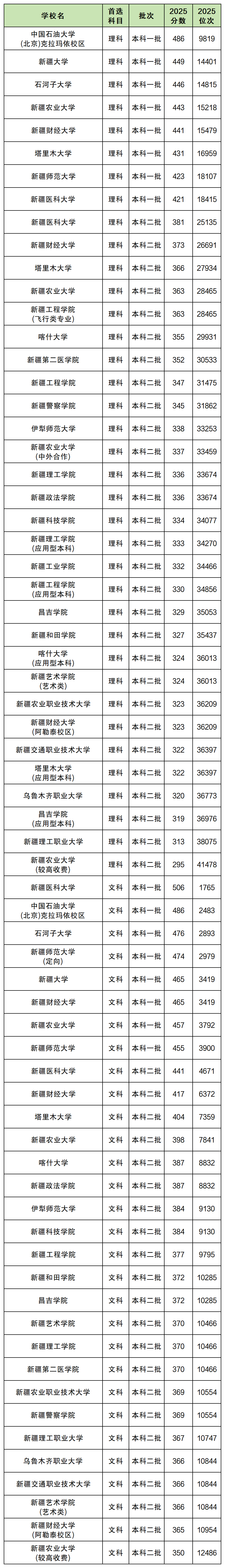 2025年新疆公办本科大学在新疆自治区内的最低分数线: