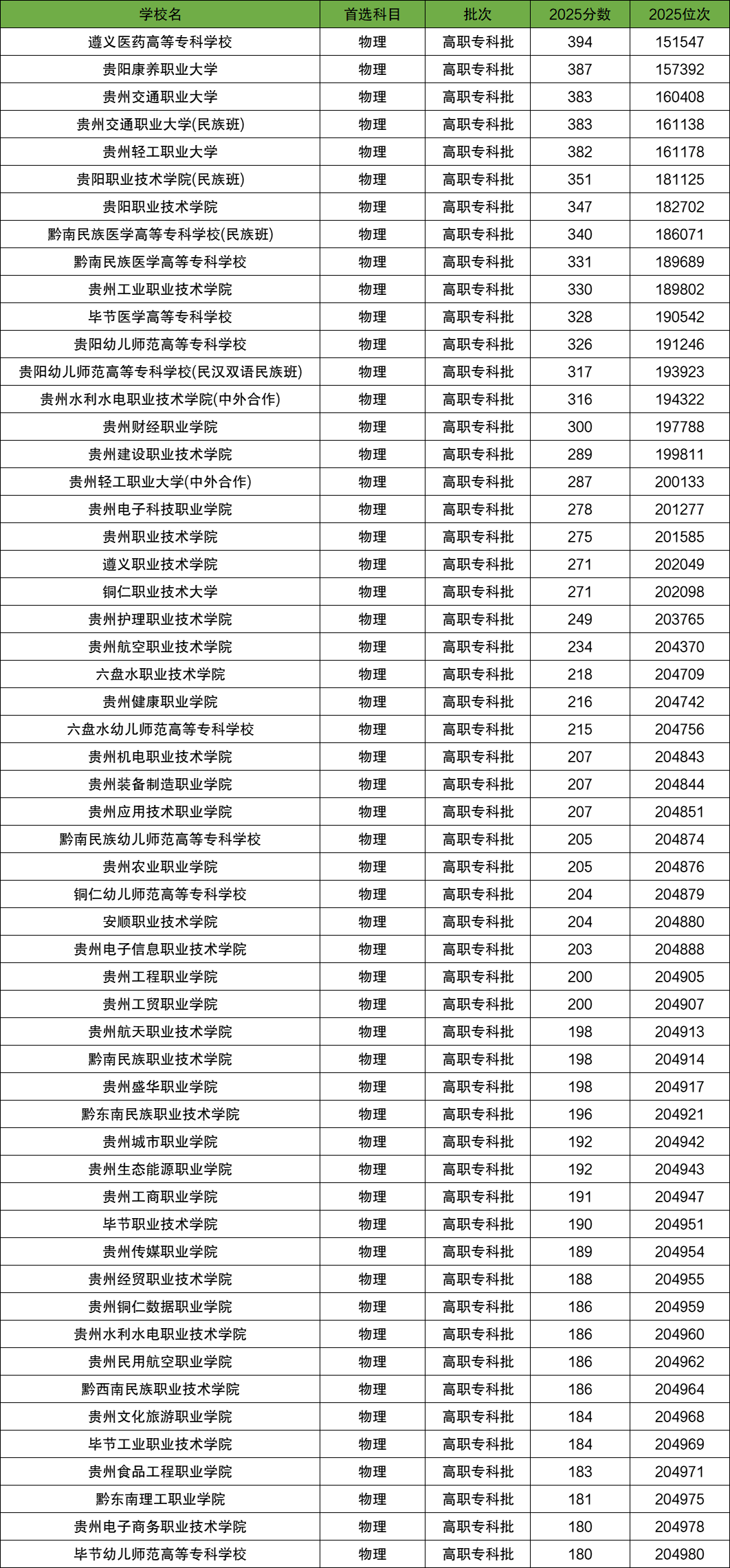 2025年贵州各专科大学录取分数线最低是180分、最高是394分。