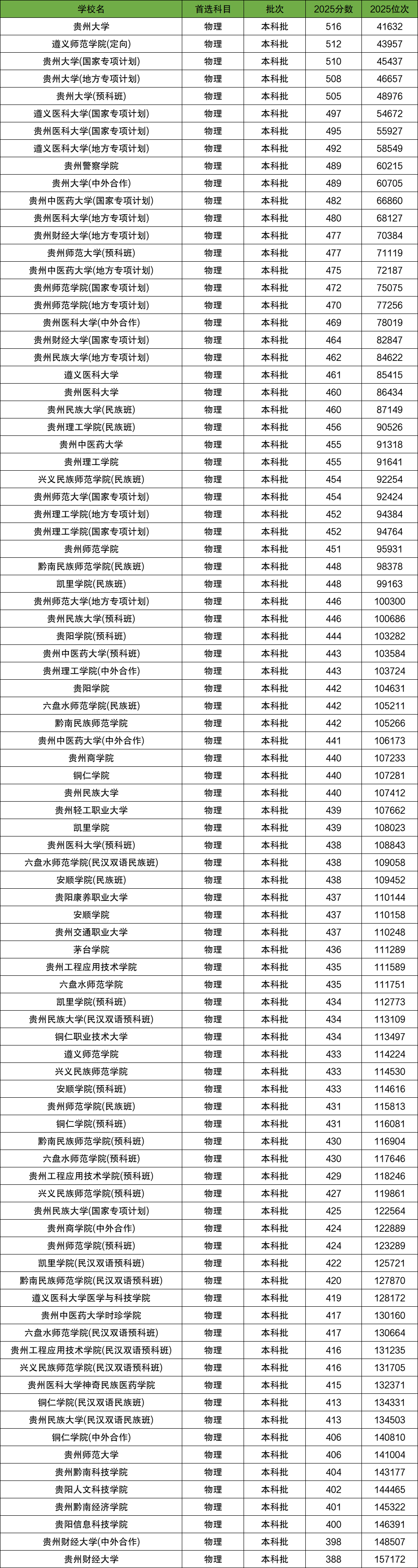 本文使用2025年贵州省物理类录取数据,整理的贵州省内所有大学分数线。