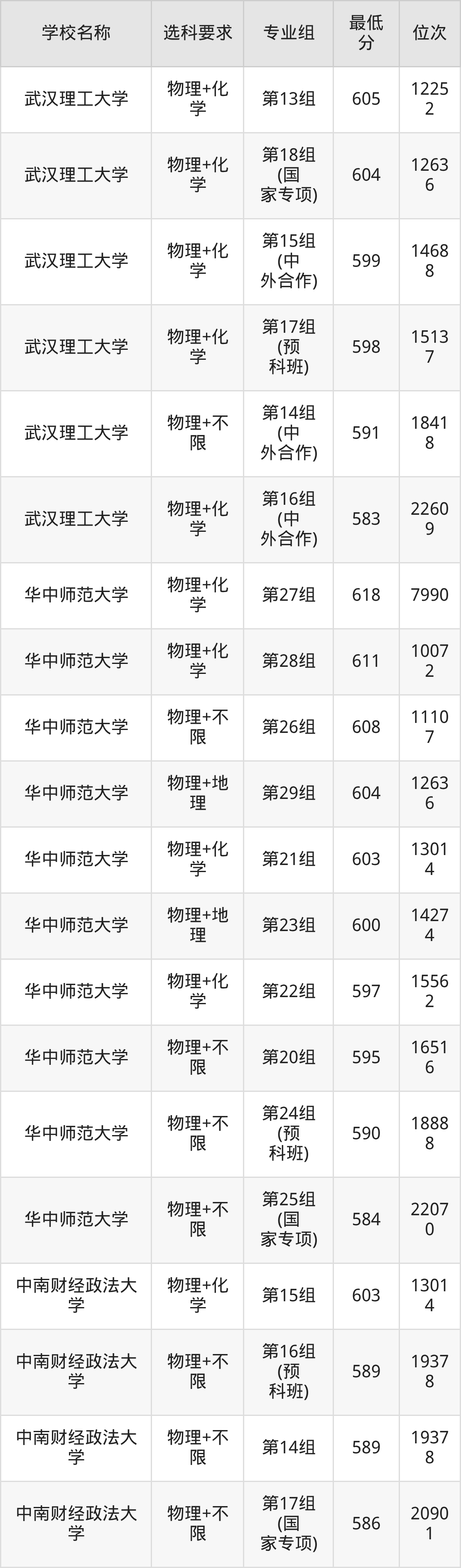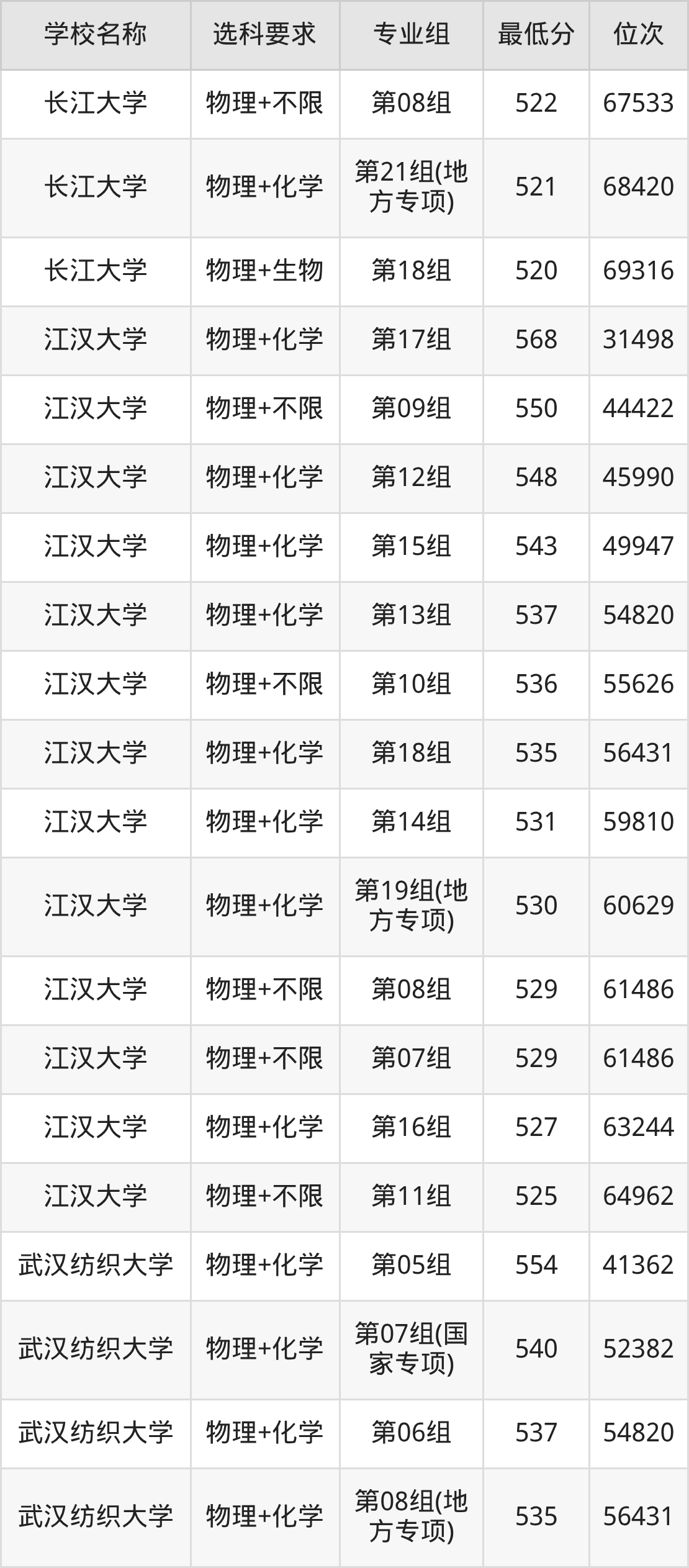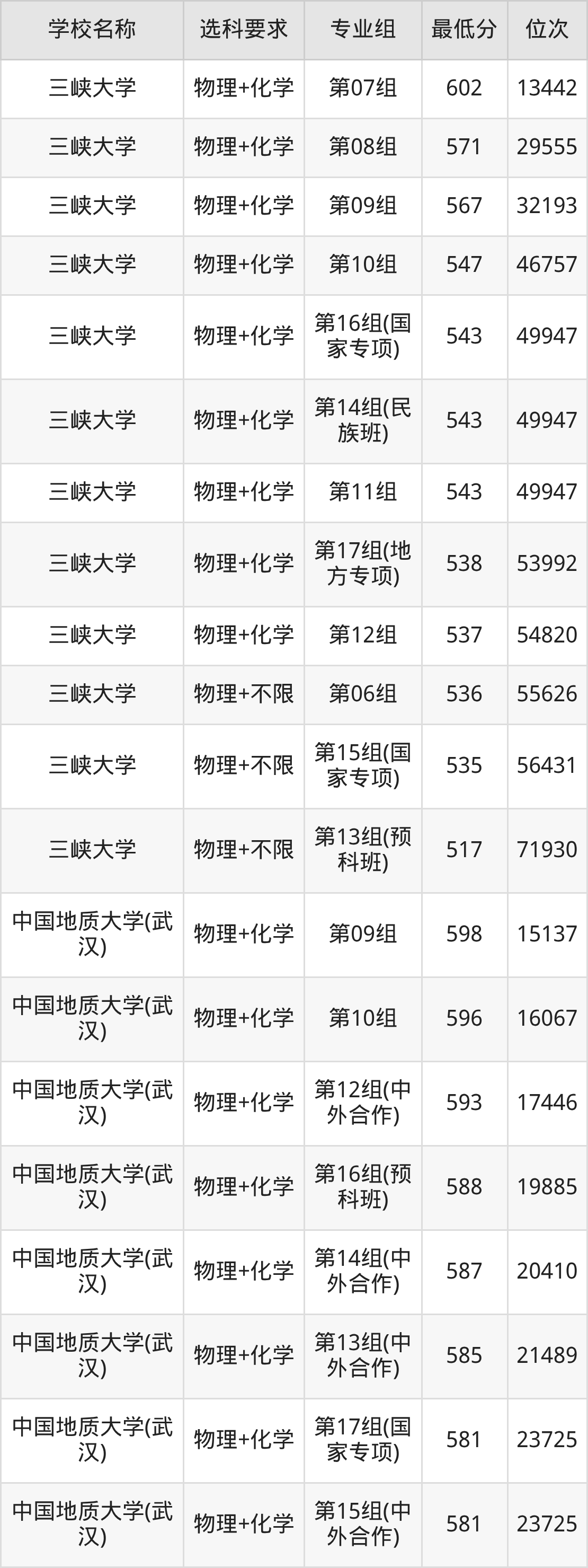 物理录取分数线一览表:
