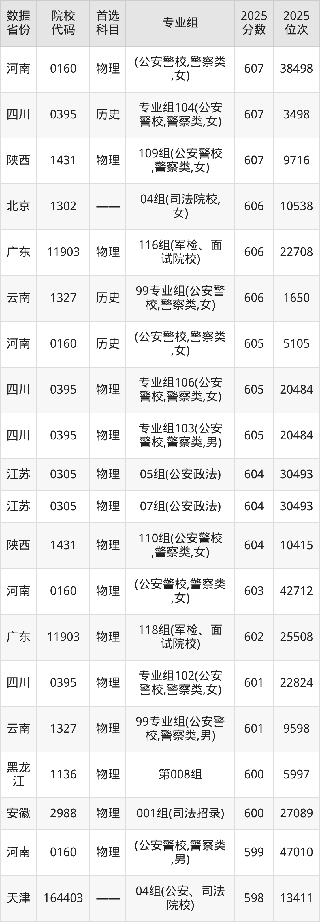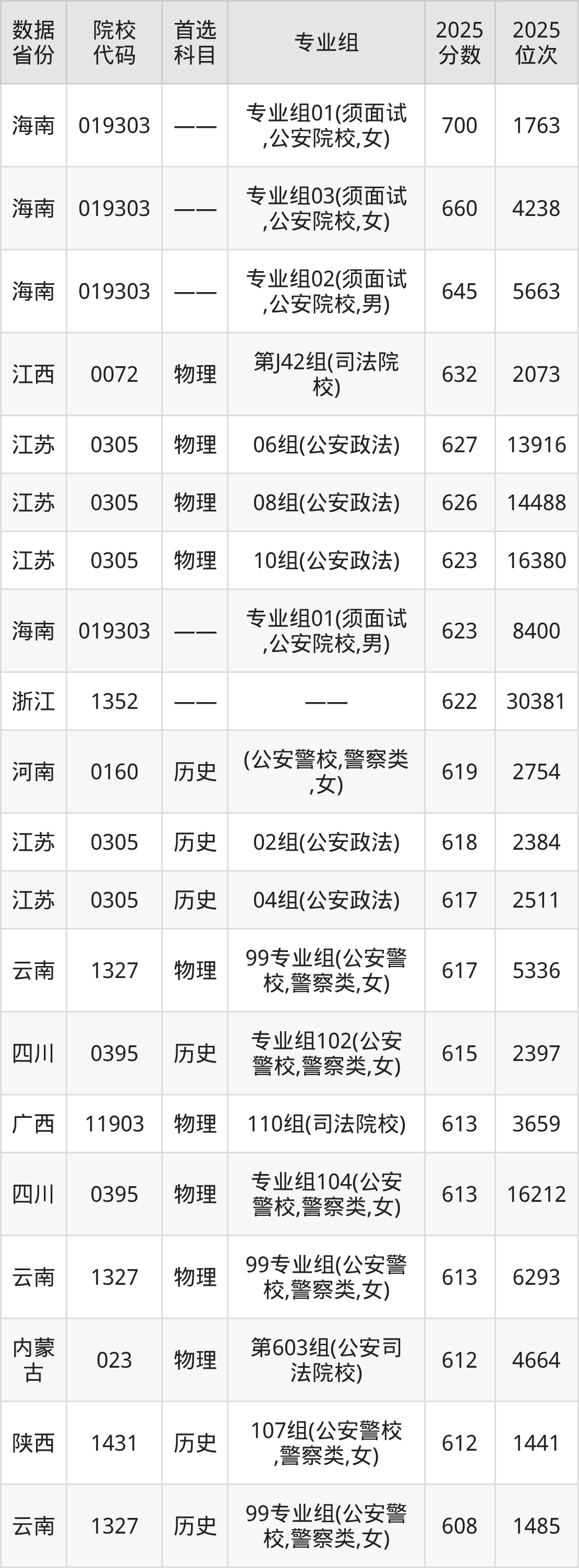 从整体看,学校录取分数区间跨度较大,既受省份差异影响,也与选考科目、招生类型(如普通类、国家专项、性别要求)密切相关。在“3+3”新高考省份,海南的录取分数较高,男生面试志愿最低分为623分;浙江为622分。在“3+1+2”新高考省份,物理类与历史类分数存在差异。例如在江苏,物理类(公安政法)最低604分,历史类为594分;在广东,物理类最低578分,历史类为548分。