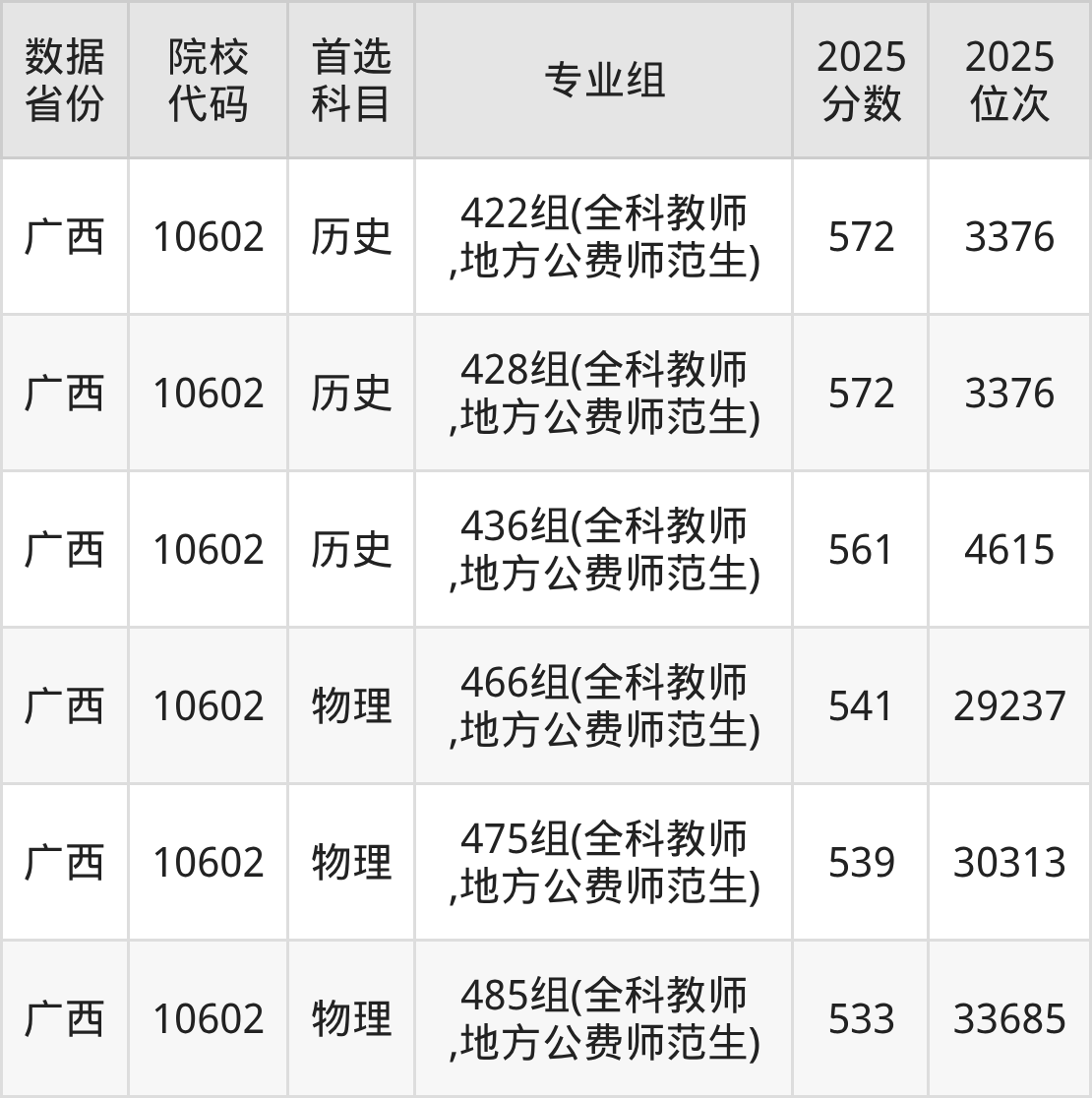 2025年广西师范大学全科教师的录取分数在同类院校中处于领先水平,体现了其较高的报考热度和社会认可度。在历史类(首选历史)招生中,全科教师的录取最低分为561分,对应位次约为4615名。作为对比,同年广西师范大学在广西普通类本科提前批(非公费师范)历史类的最低录取分为518分,位次12128名。全科教师分数线高出普通类43分,位次优势明显,竞争更为激烈。