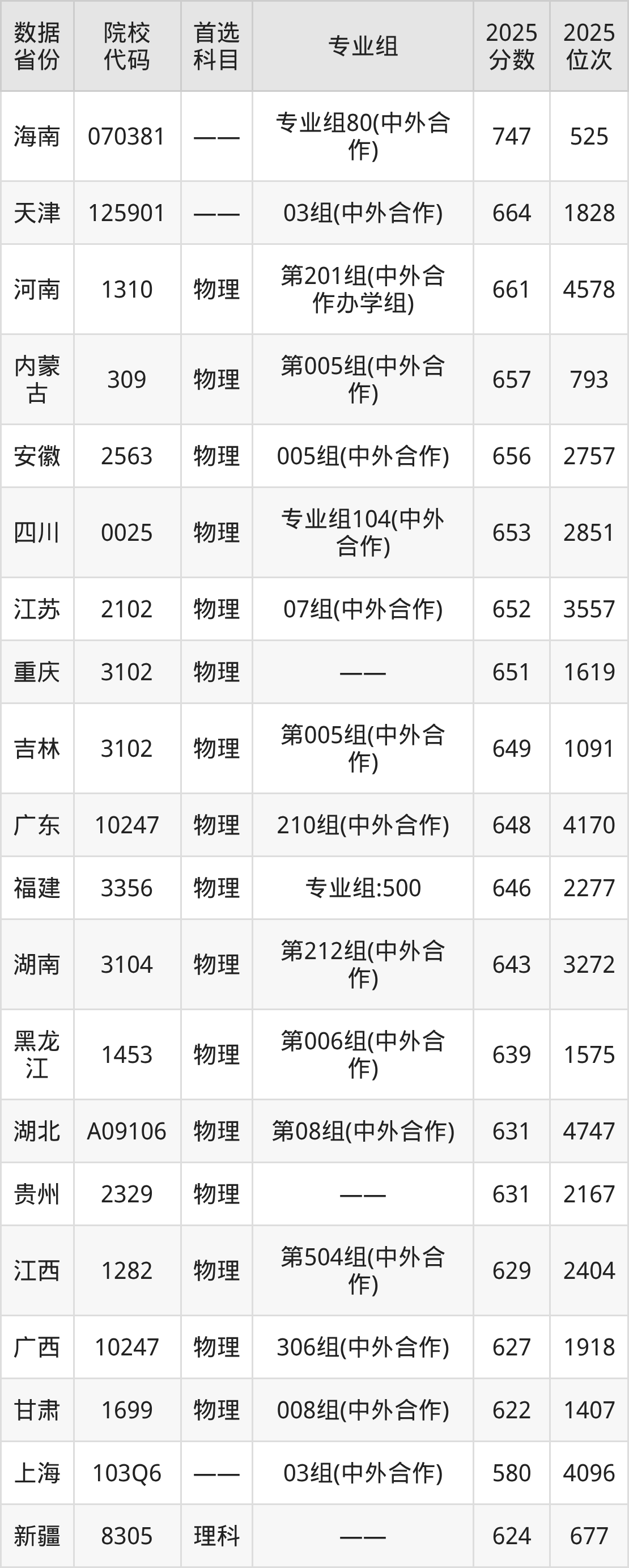 从具体省份数据观察,录取分数呈现一定的地域差异。在海南,中外合作办学专业组的录取最低分达到了747分,对应位次525名,甚至高于该校在当地普通本科批744分的录取线,显示出极高的热度。在北京、天津、江苏等教育强省(市),录取最低分也集中在652分至664分之间,位次基本在省内前4000名以内。