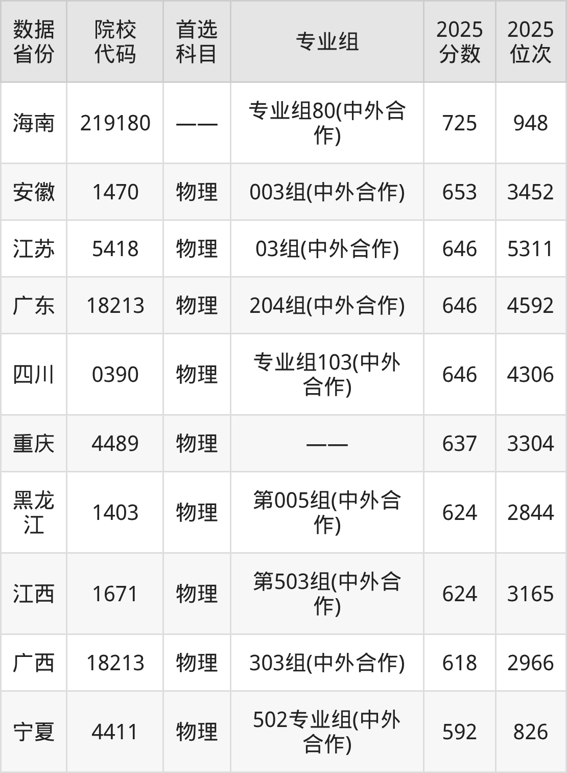 从这一组数据可以直观看出两点:第一,该校在海南的整体生源质量极高,普通类专业录取位次进入全省前300名,属于顶尖梯队。第二,其中外合作办学项目的录取分数和位次(725分/948名)相较于普通类专业(774分/240名)存在一定差距。这反映了在相同院校背景下,中外合作办学项目因学费较高,通常录取分数线会略低于普通同类专业,这为分数稍低但家庭条件允许、且向往该校优质教育资源的考生提供了一个重要的报考机会。