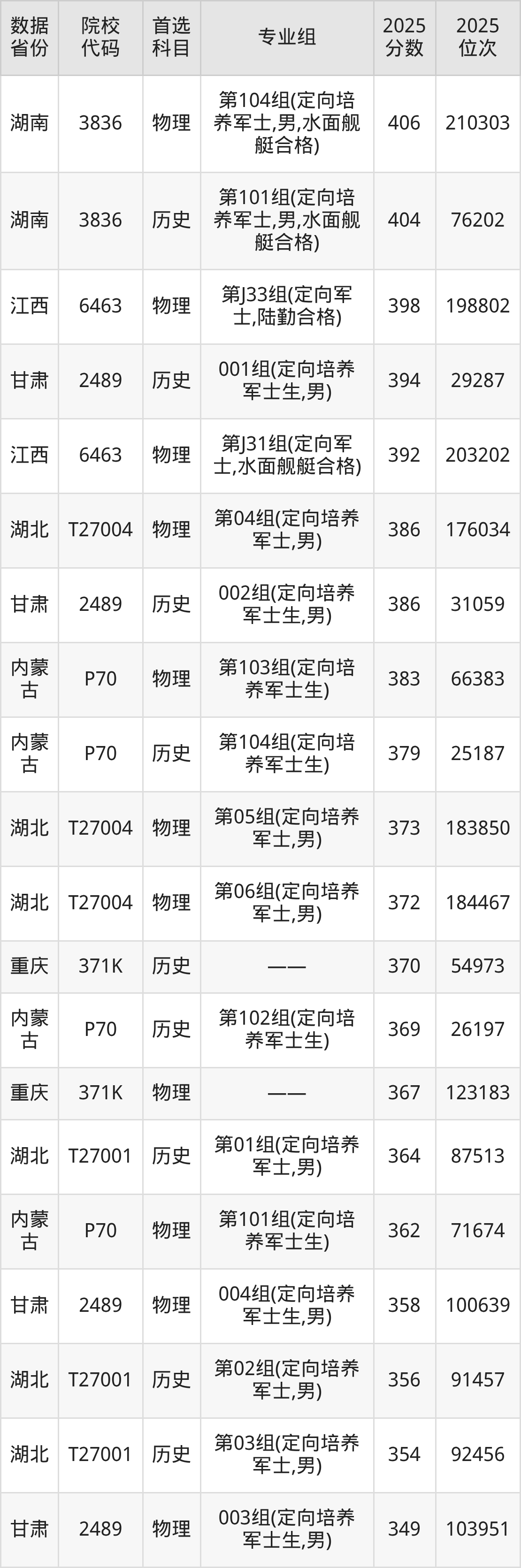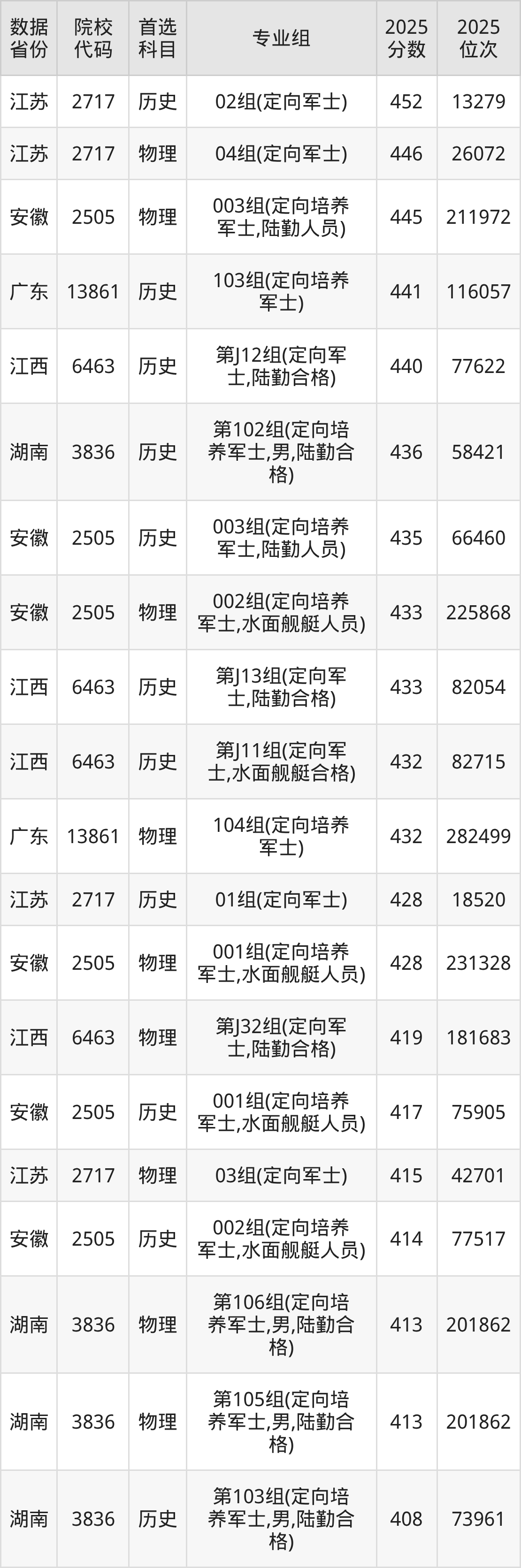 从2025年情况看,各省提前批次录取分数差异明显。在江苏省,历史类(首选历史)定向培养军士录取最低分为428分,对应位次约69922名;物理类(首选物理)为415分,对应位次约236353名。在安徽省,面向“水面舰艇人员”的招生,历史类最低分为417分,物理类为428分。湖南省提前批次(男生)历史类最低404分,物理类最低406分。甘肃省高职专科提前批E段,历史类定向培养军士最低分达394分,物理类为349分。