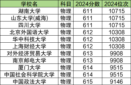 位次在10000左右的基本属于985或实力较强的211院校,分数在611-615分之间,比本科线高163-167分。其中位次相对靠后的有湖南大学、山东大学(威海)、四川大学、北京外国语大学。