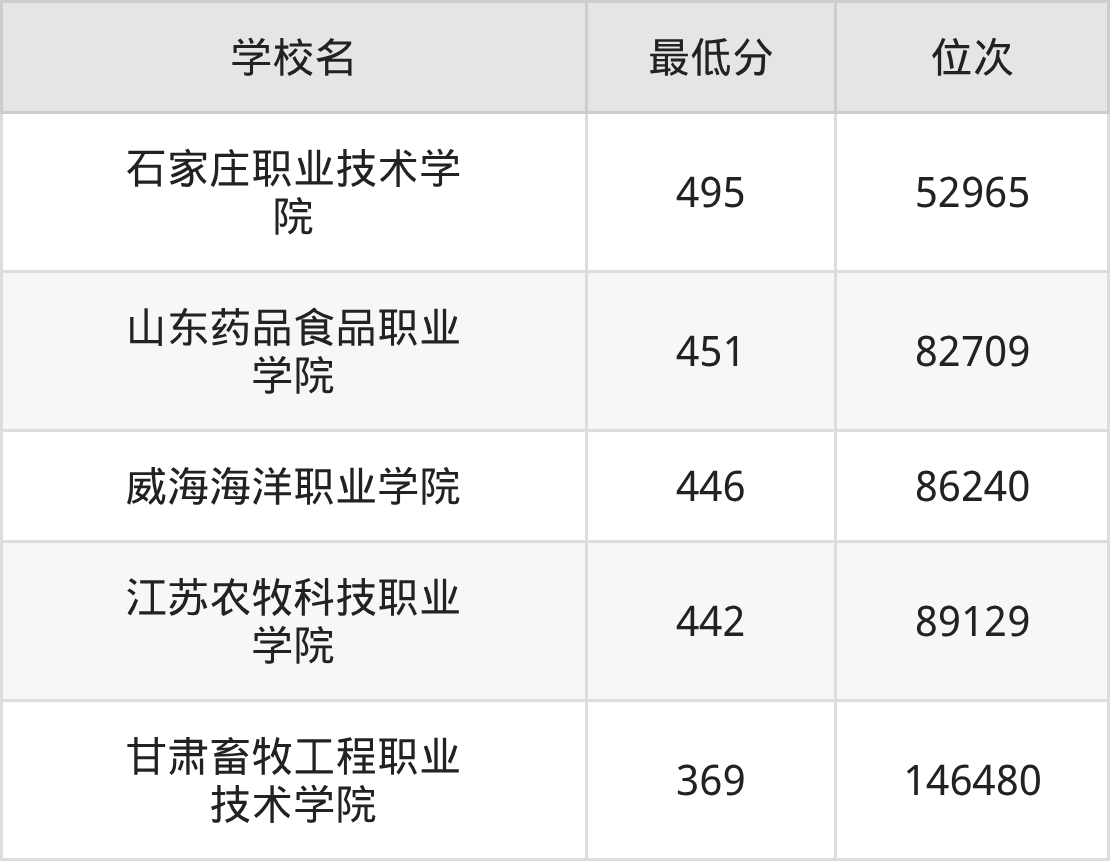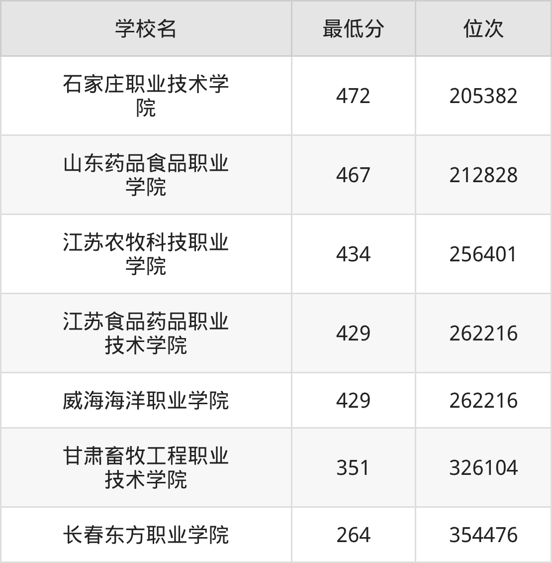 食品药品监督管理专业录取分数线最低的公办专科大学则是甘肃畜牧工程职业技术学院,2025年分数线为351分,与录取分数线最高的石家庄职业技术学院相差121分。