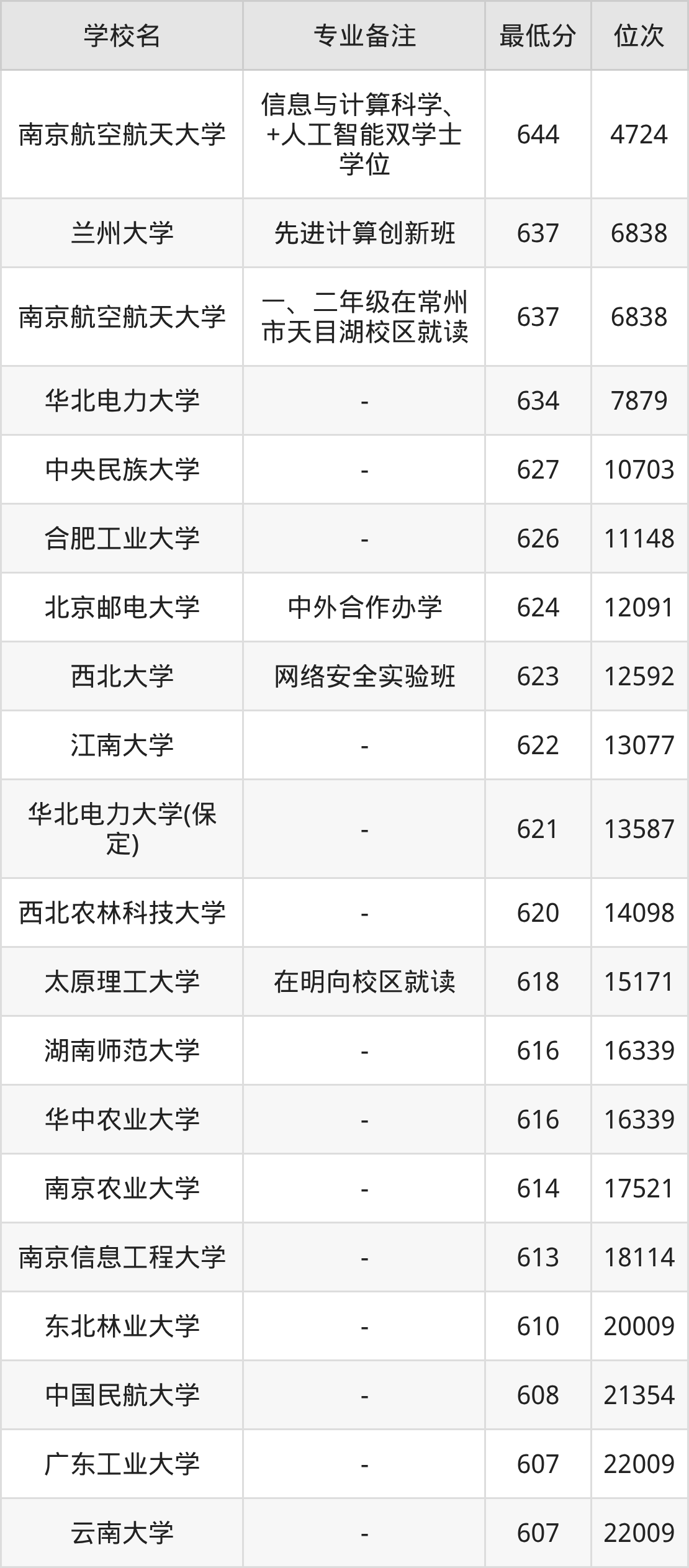 信息与计算科学专业分数线排名前三的院校为:南京航空航天大学644分、兰州大学637分、华北电力大学634分。