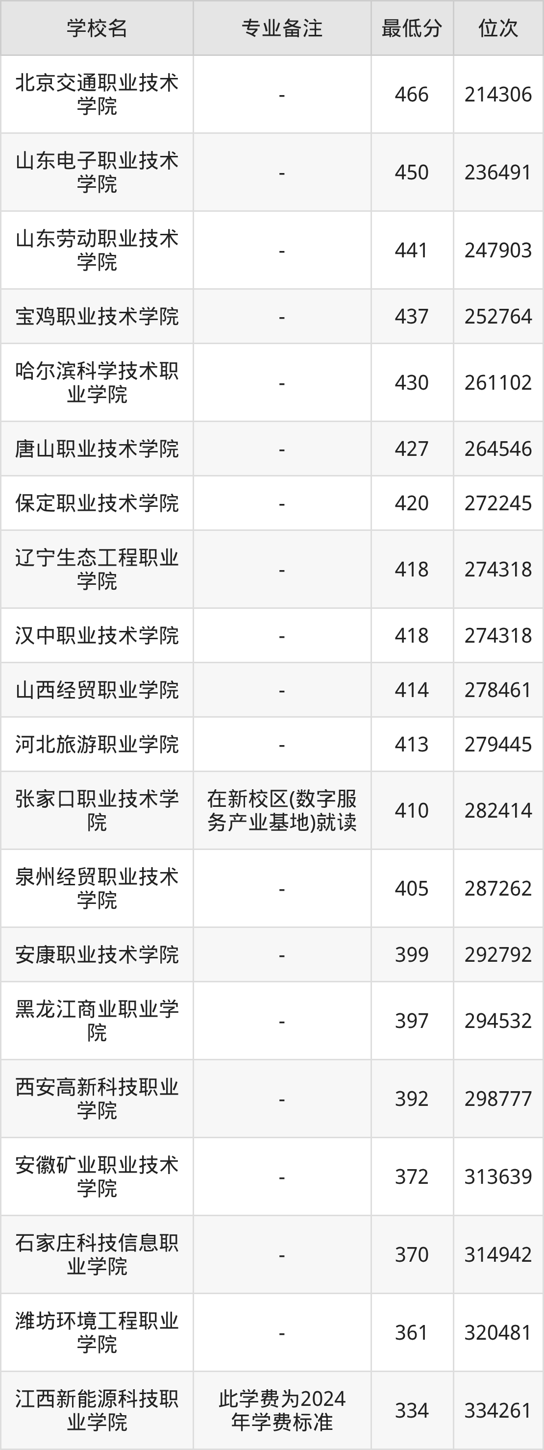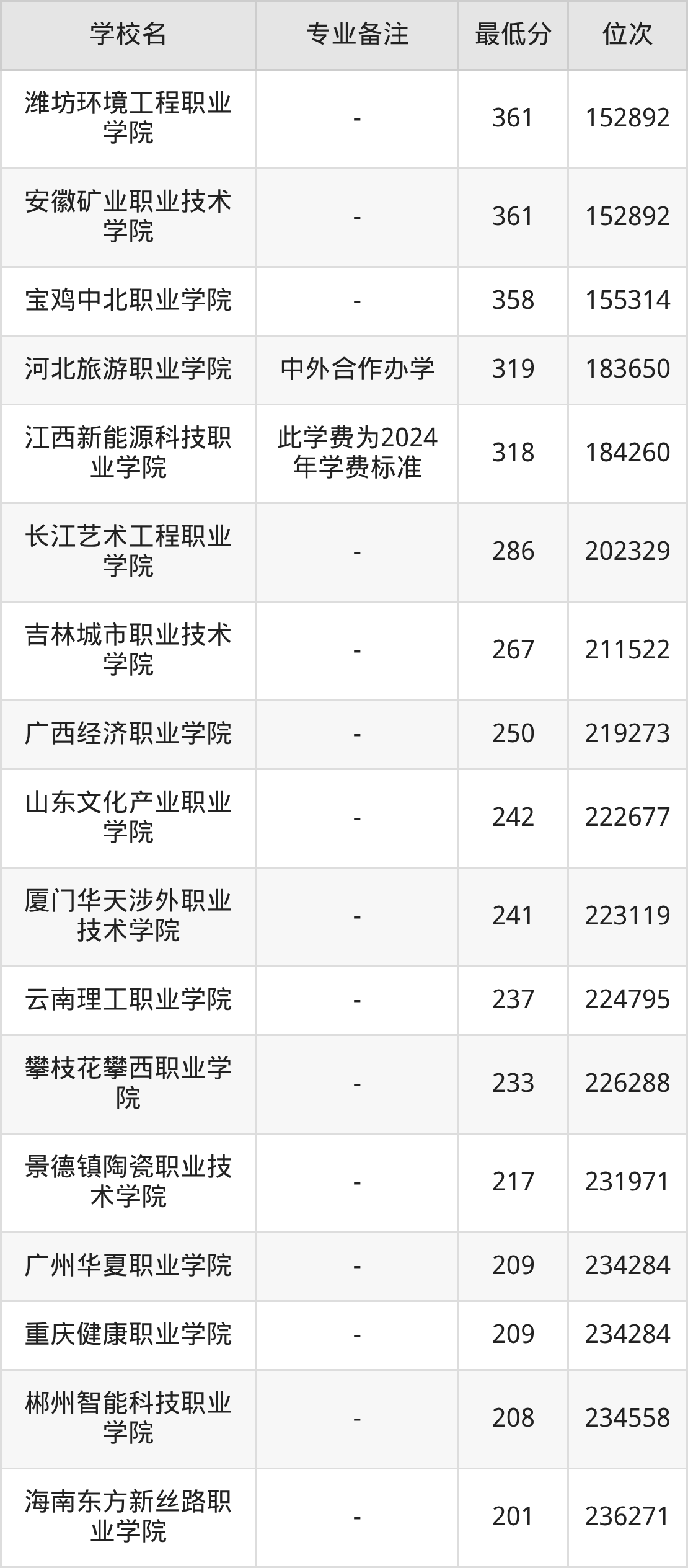 数字媒体艺术设计专业录取分数线最低的公办专科大学则是河北旅游职业学院,2025年分数线为227分,与录取分数线最高的北京交通职业技术学院相差239分。