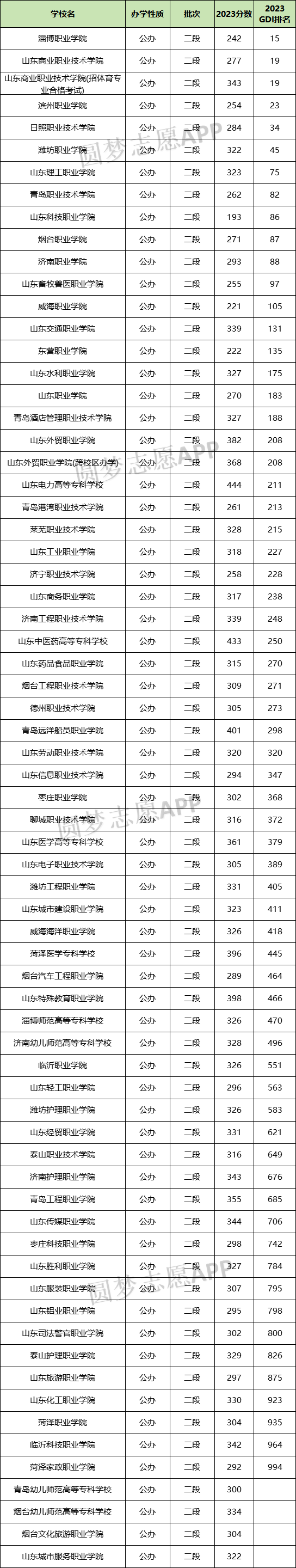 下表为2023年山东省各公办专科院校的排名和录取分数,各位可以在圆梦志愿app测评被山东各大学的录取概率。