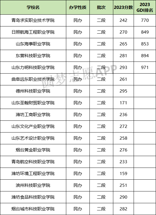 下表为2023年山东省各民办专科院校的排名和录取分数