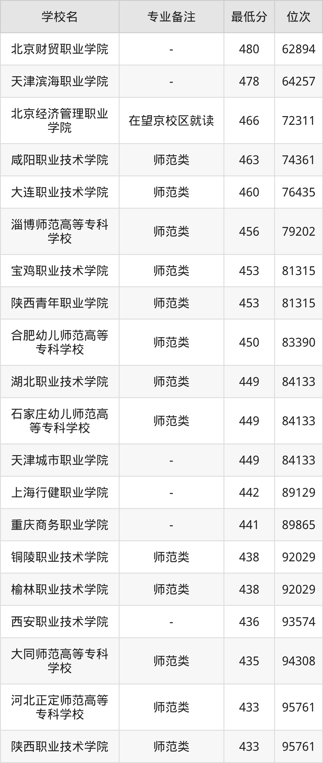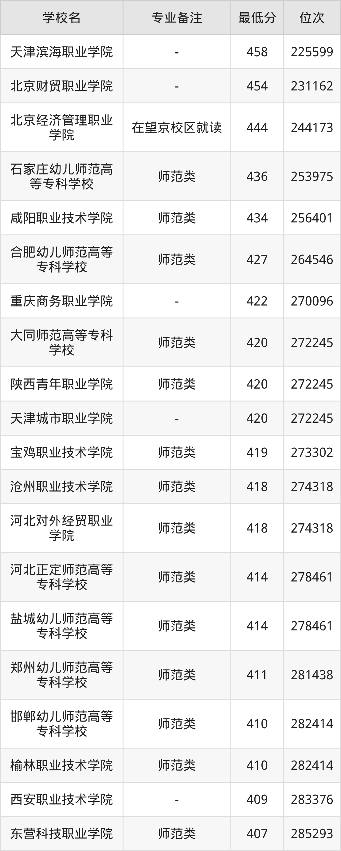 学前教育专业分数线排名前三的院校为:天津滨海职业学院458分、北京财贸职业学院454分、北京经济管理职业学院444分。