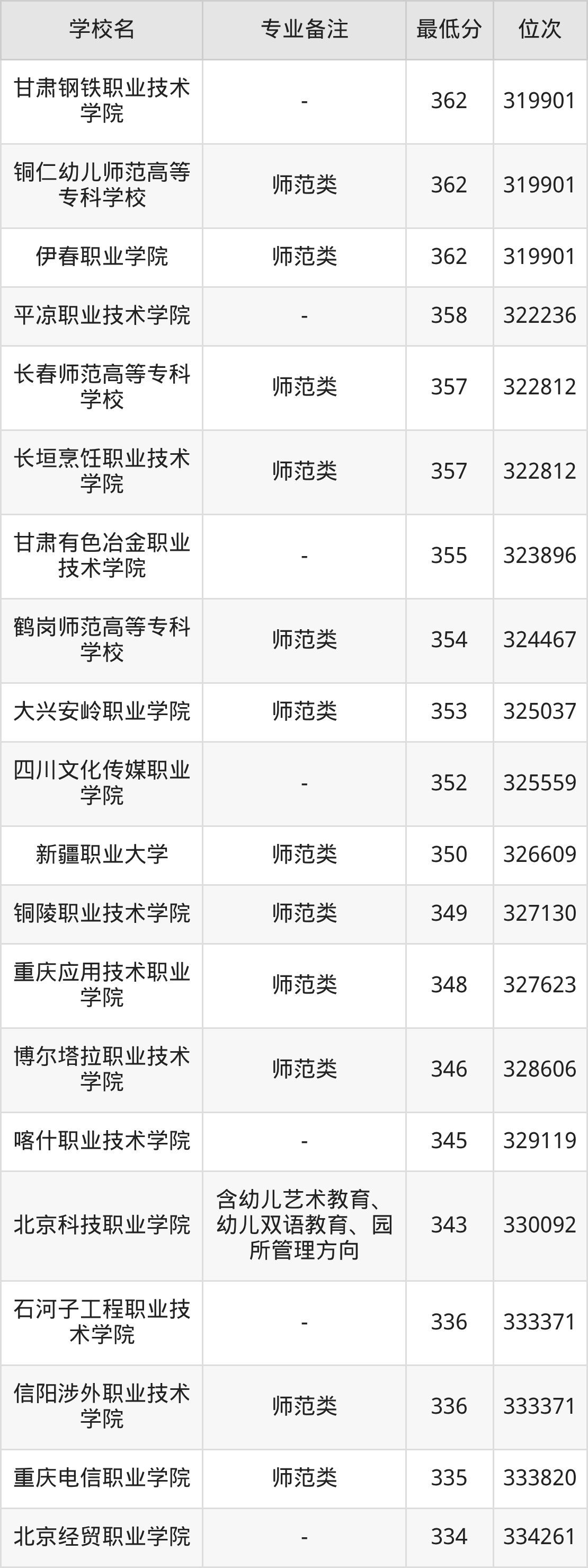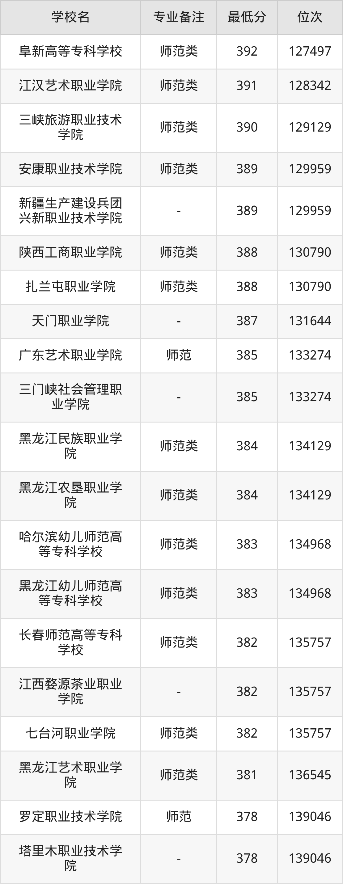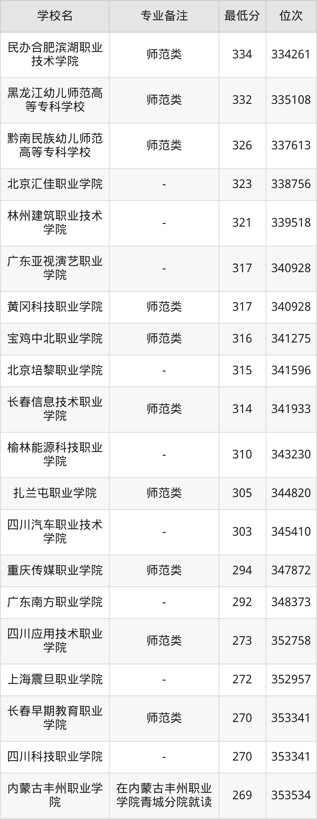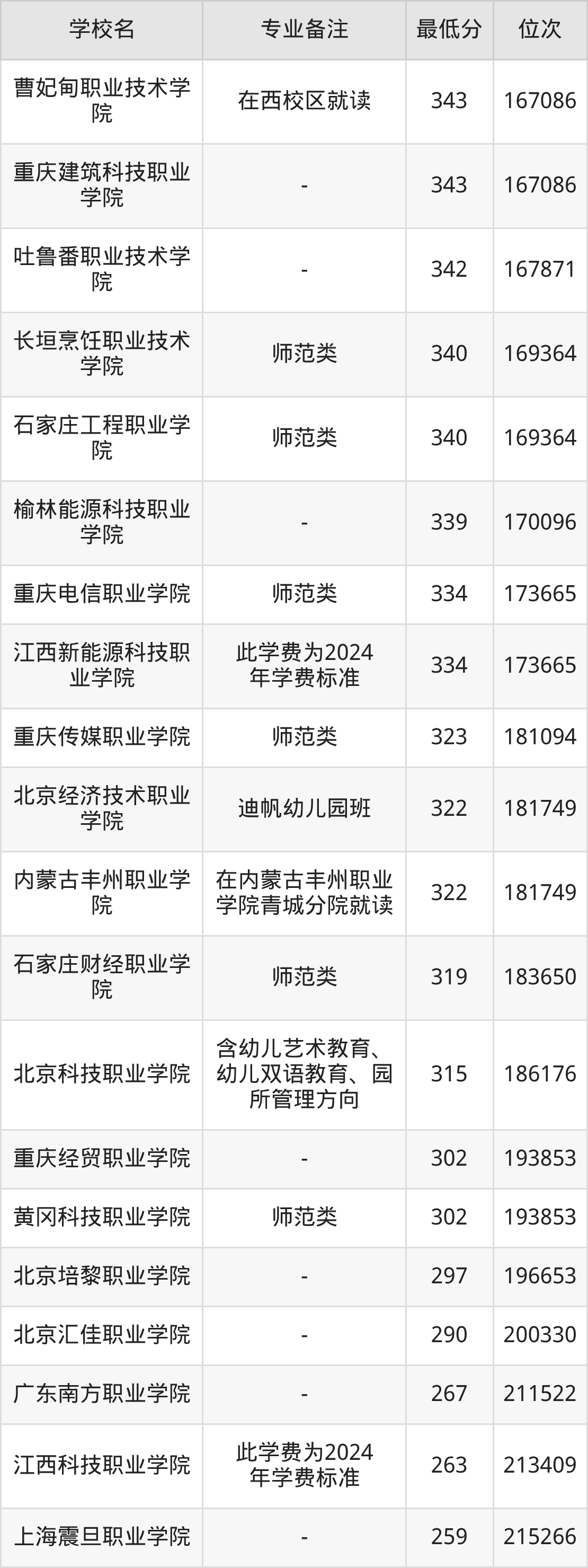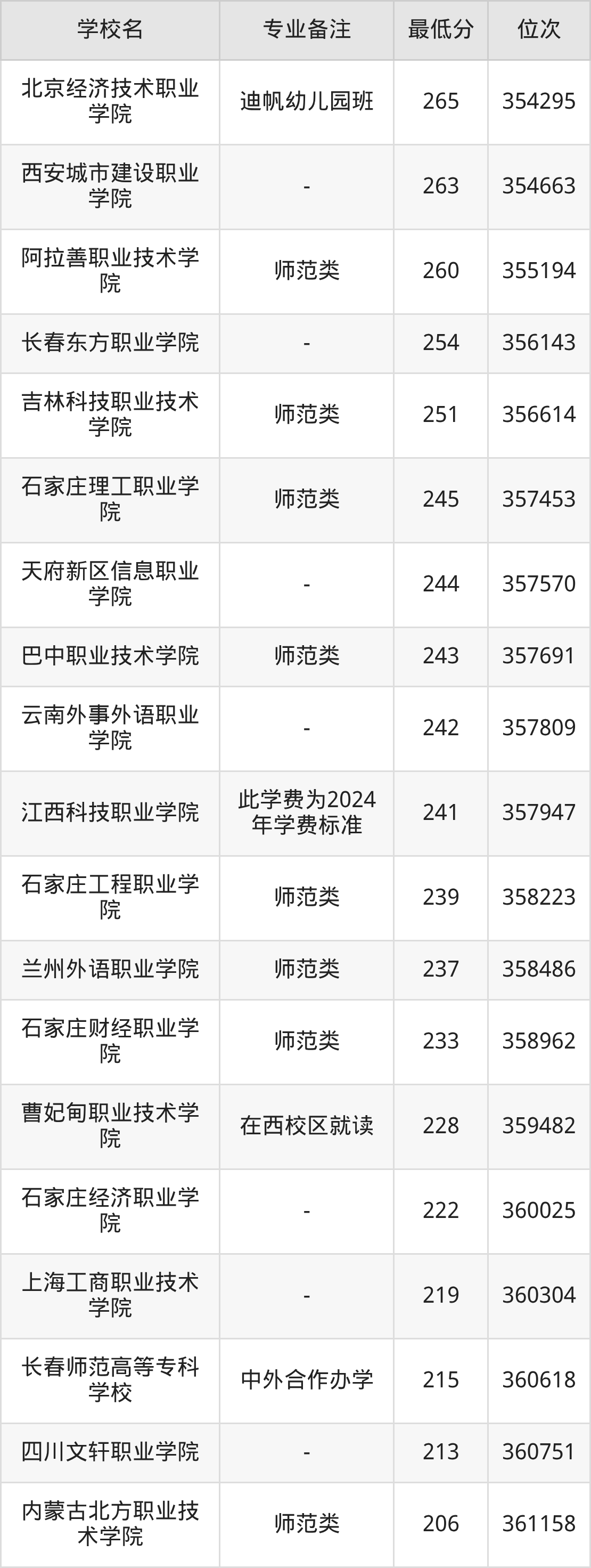 学前教育专业录取分数线最低的公办专科大学则是长春师范高等专科学校,2025年分数线为215分,与录取分数线最高的天津滨海职业学院相差243分。