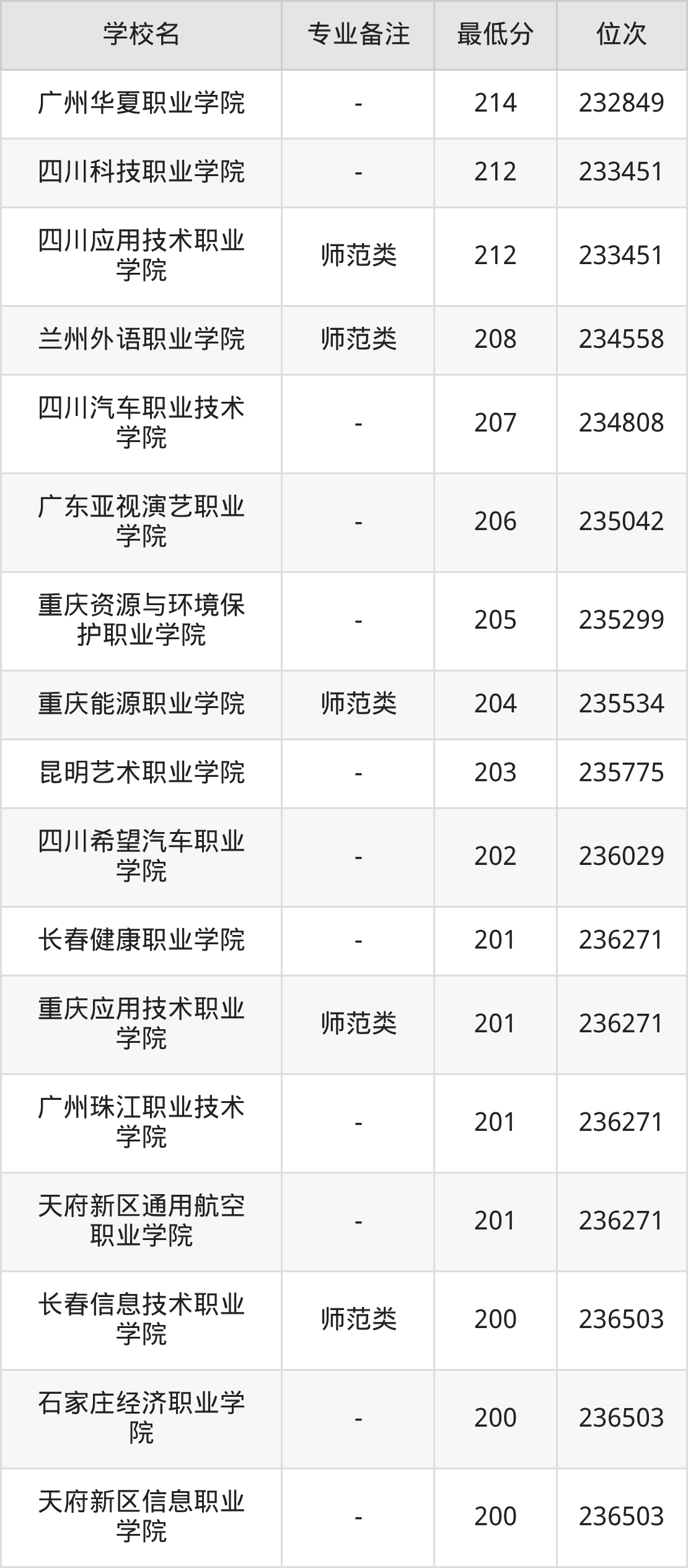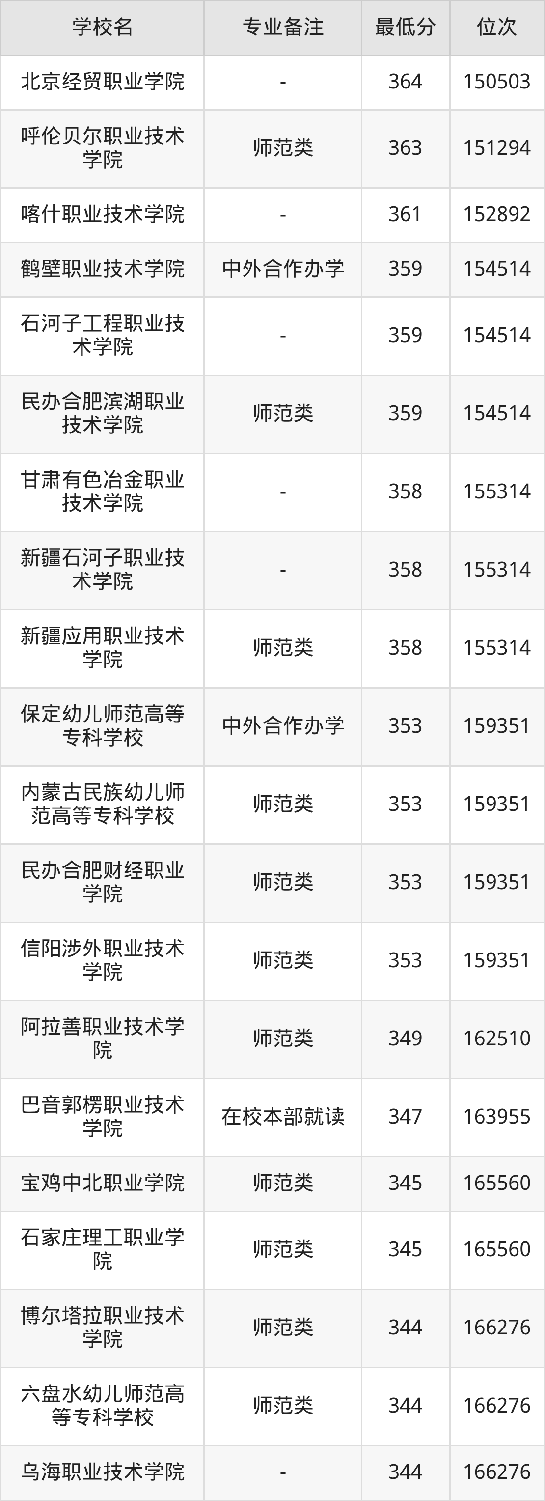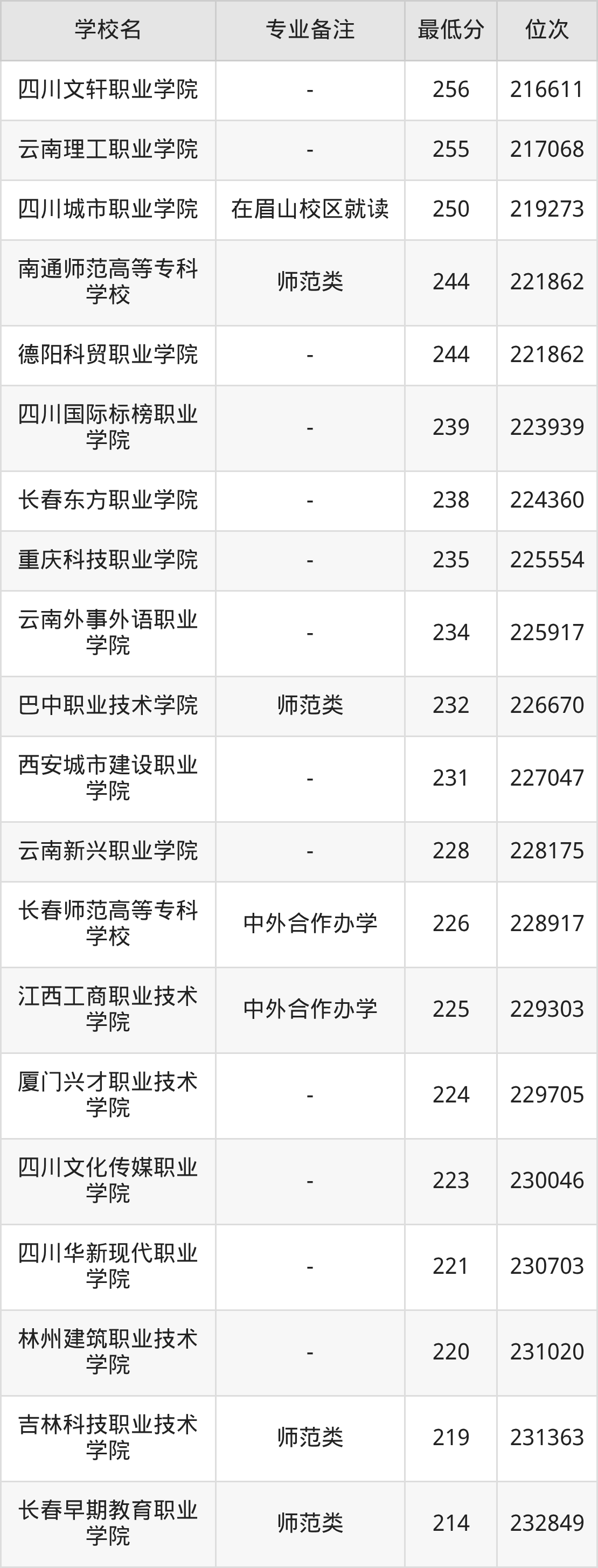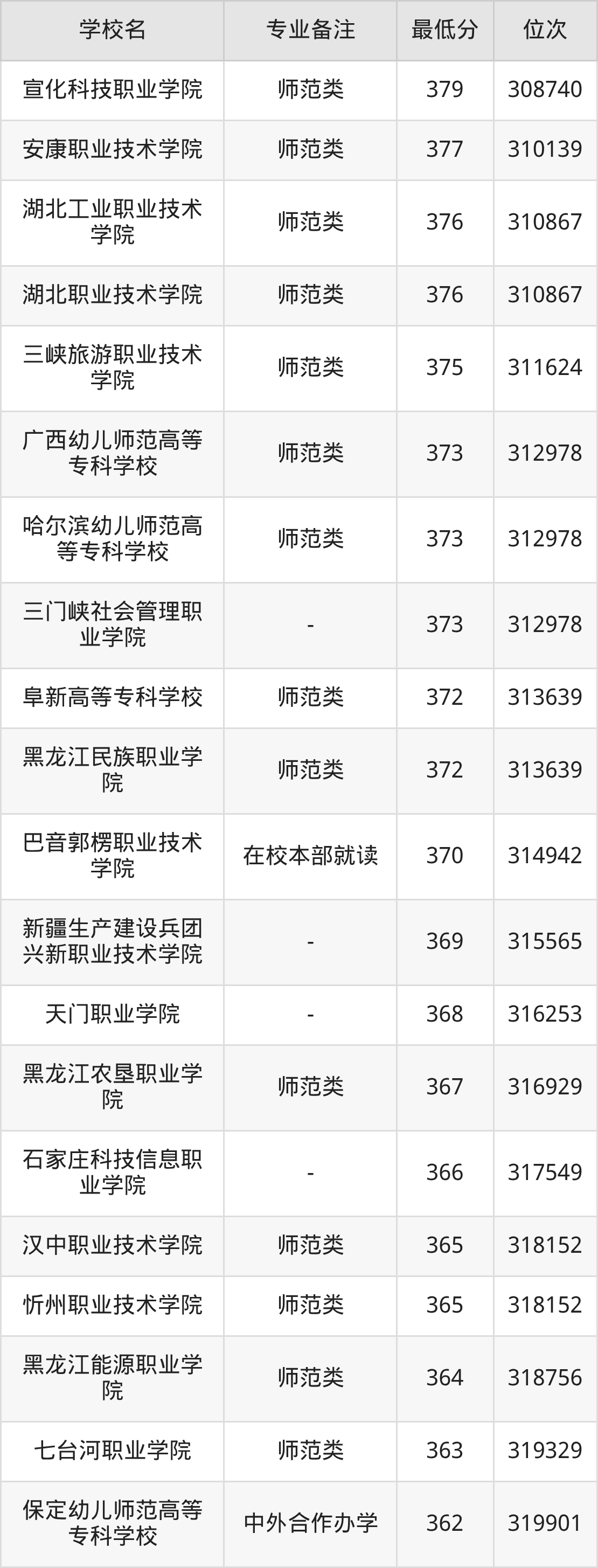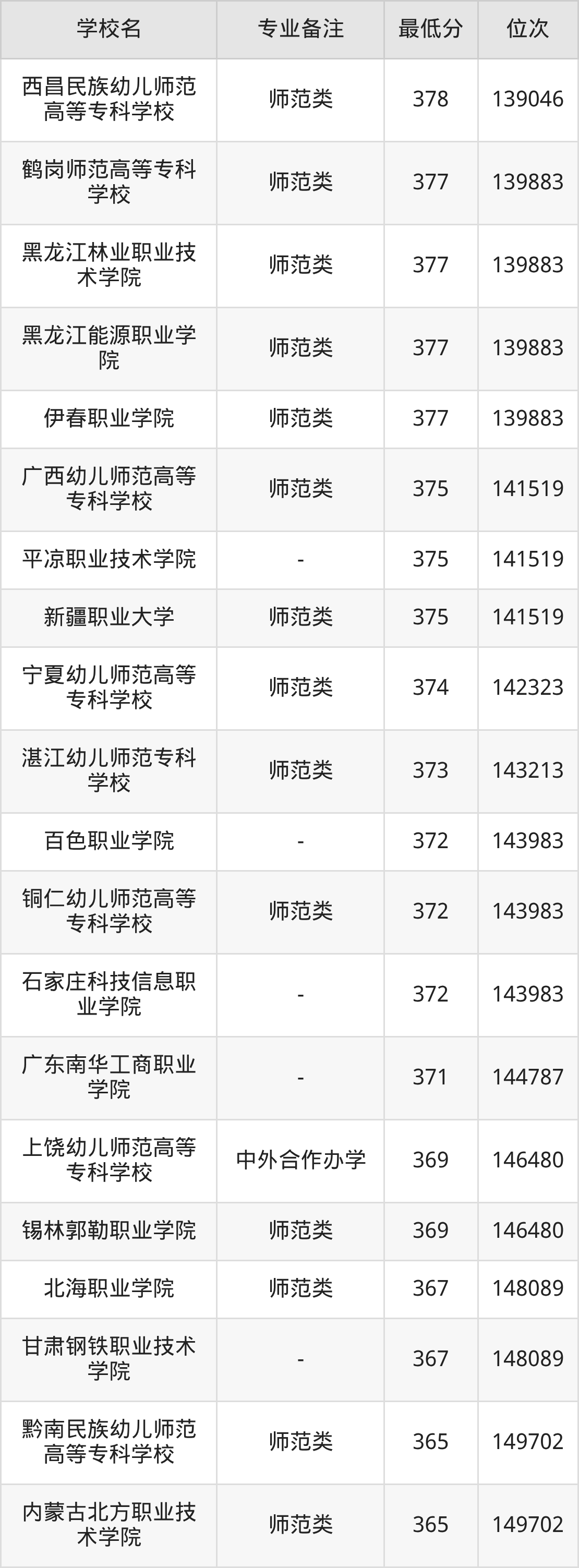 学前教育专业录取分数线最低的公办专科大学则是长春师范高等专科学校,2025年分数线为215分,与录取分数线最高的天津滨海职业学院相差243分。