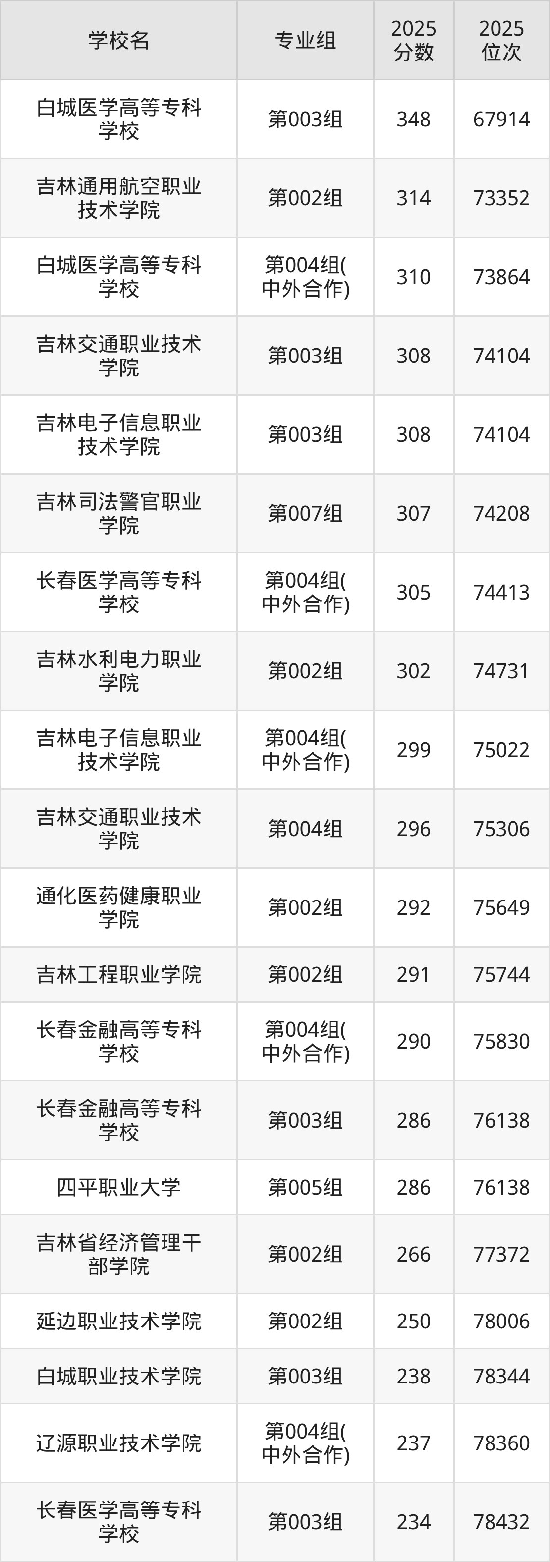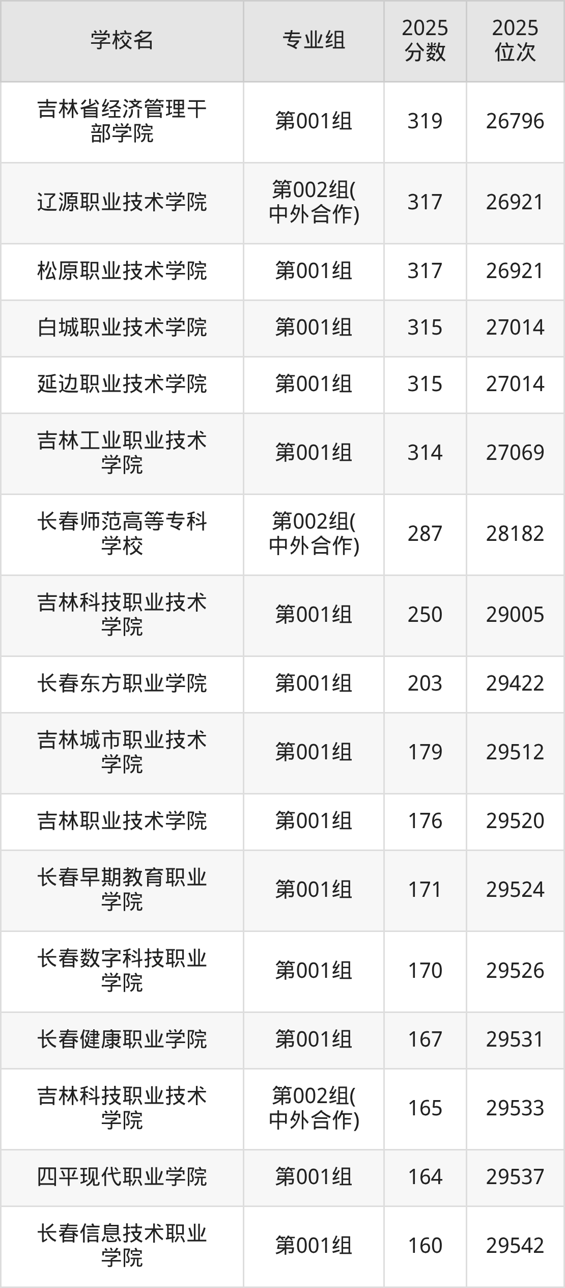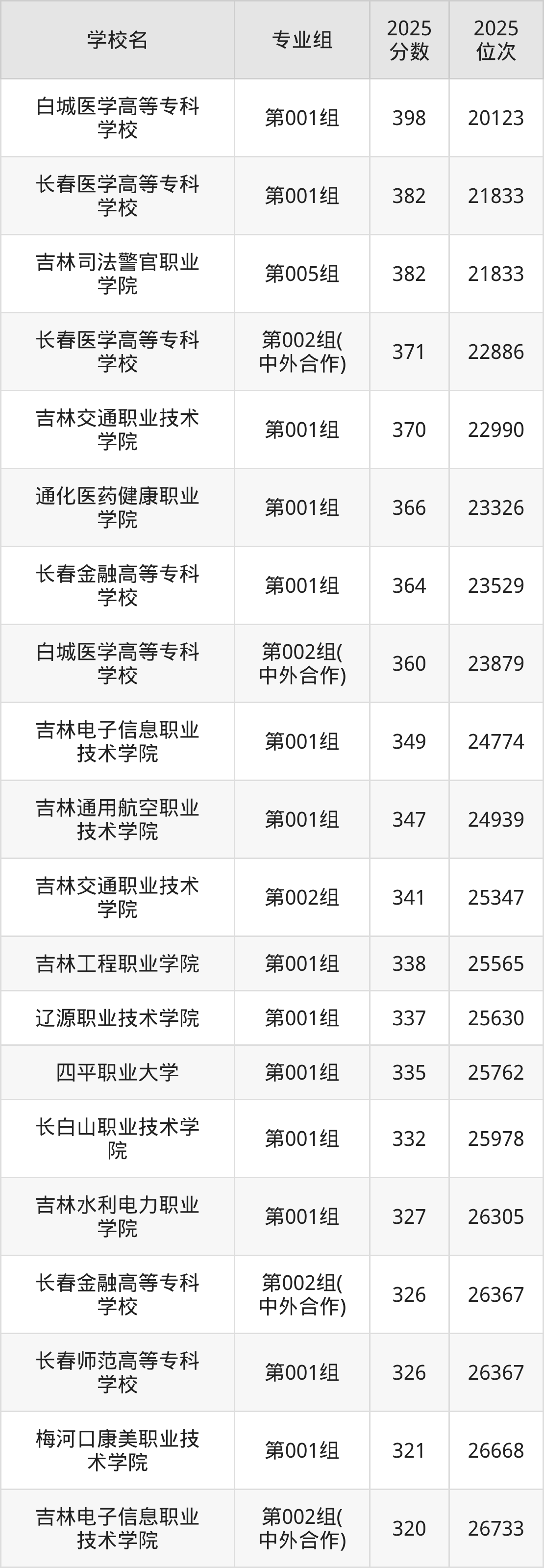 2025年吉林历史组招生的专科院校专业组共计37个,其中录取分数线最低的为长春信息技术职业学院,2025年最低分是160分,对应的是第001组,位次排名是29542名。收分最高的是白城医学高等专科学校,2025年第001组最低分是398分,位次排名是20123名。