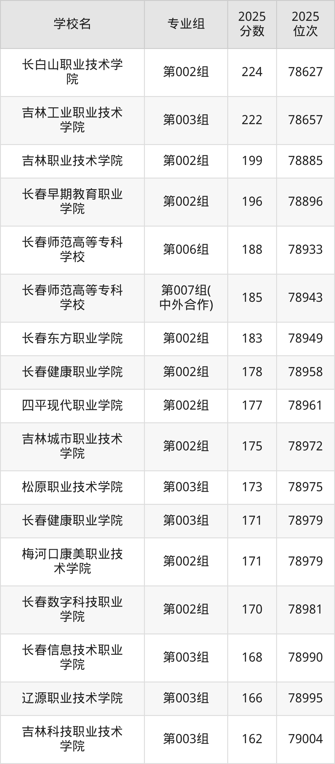 长春医学高等专科学校:234分到305分,最低分为第003组、最高分为第004组(中外合作)。