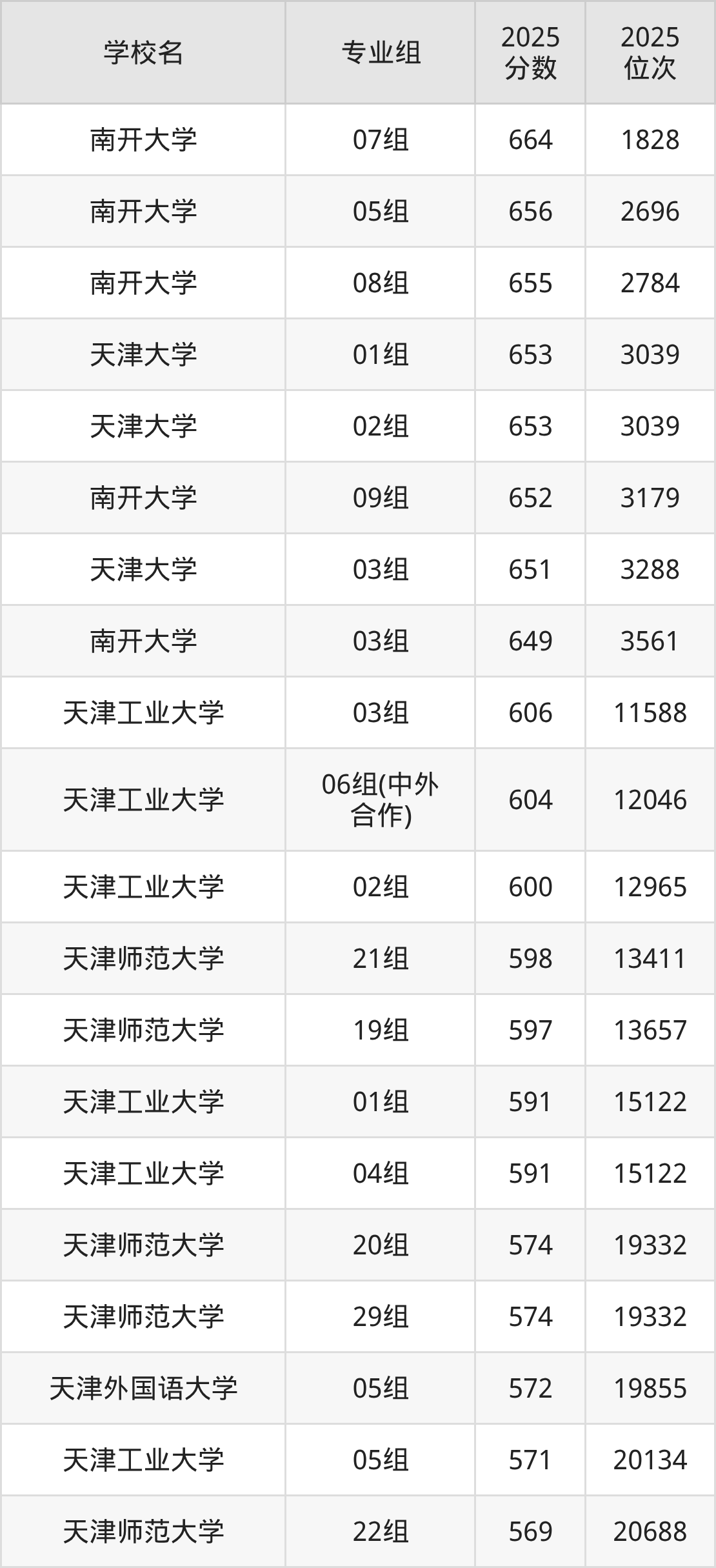 天津大学:651分到653分,最低分为03组、最高分为01组、02组;