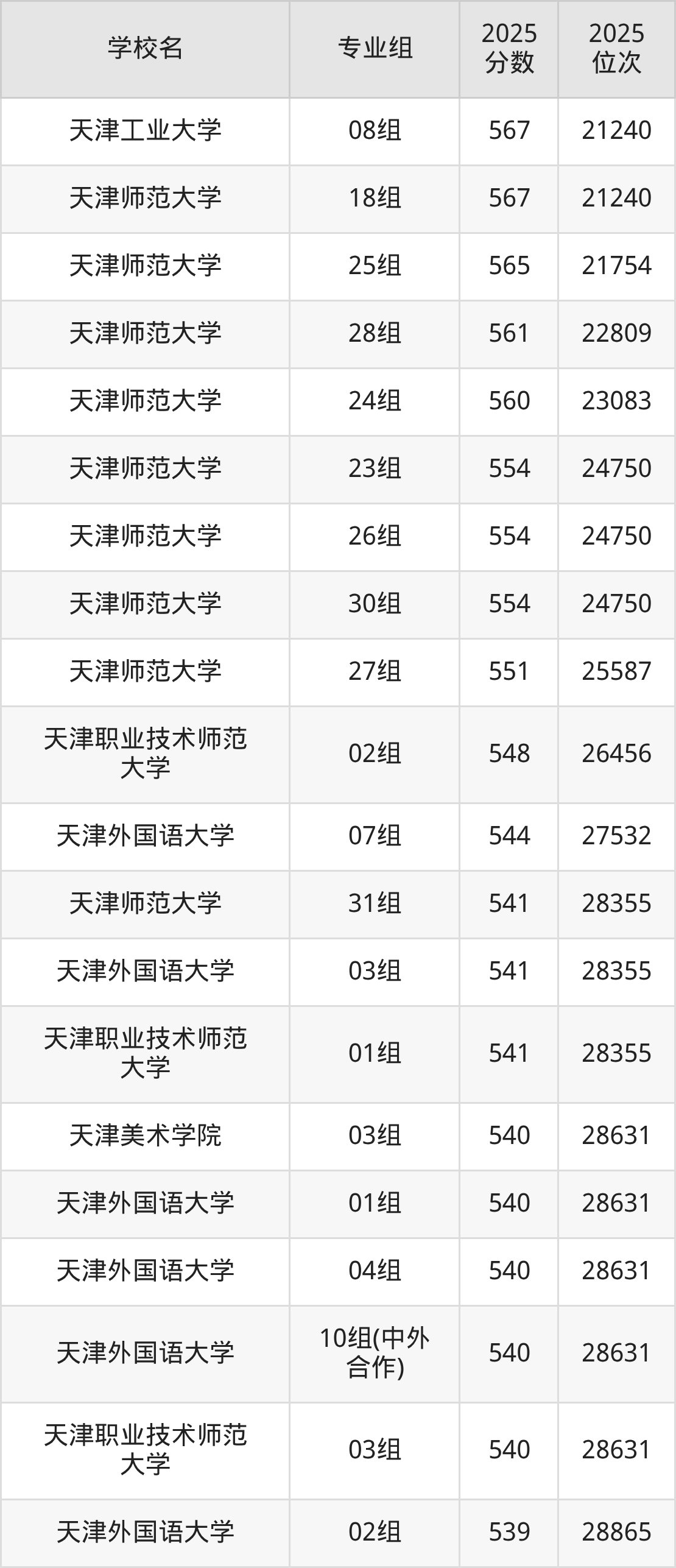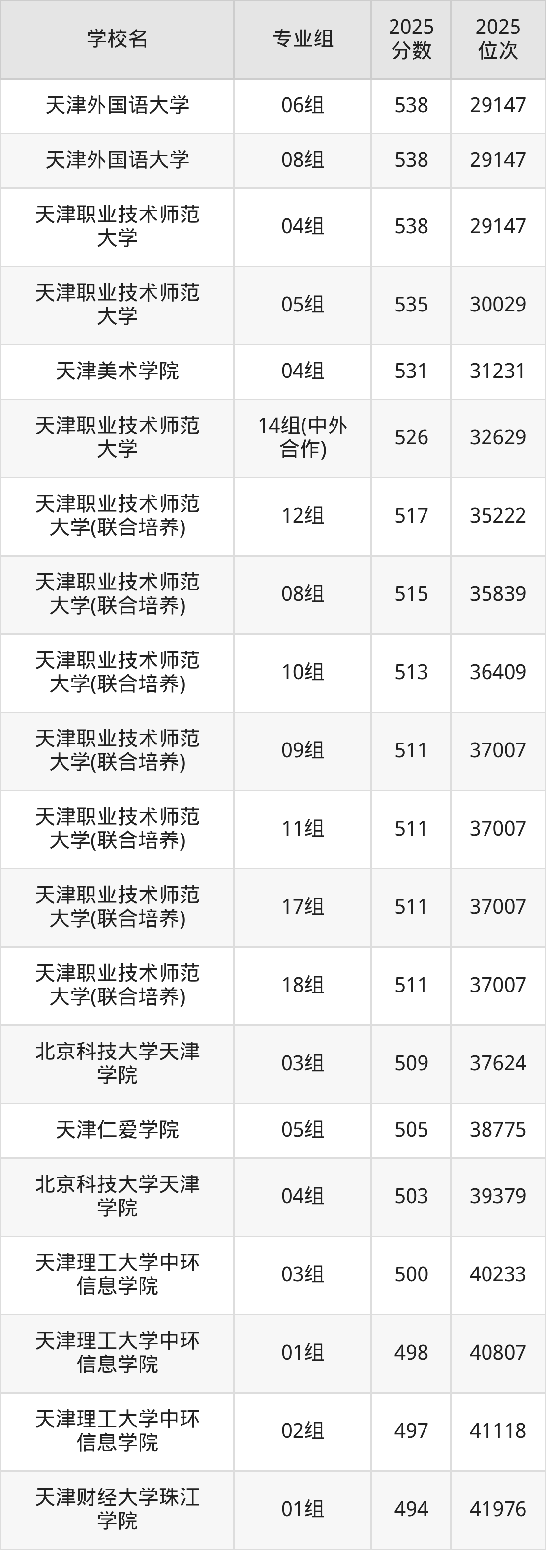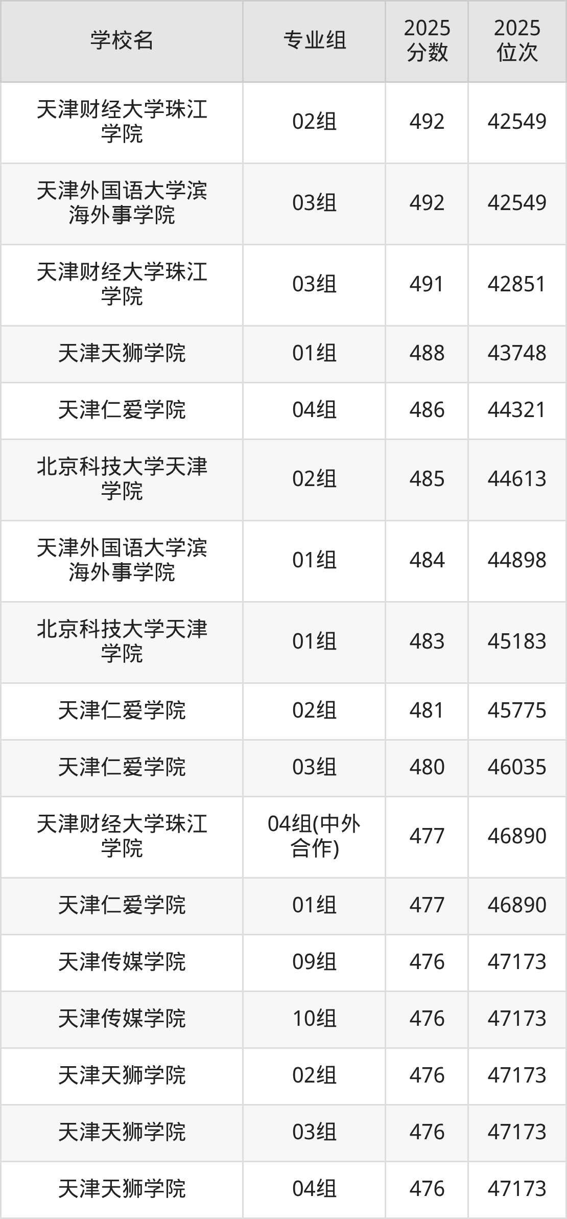 2025年天津招生的文科大学专业组共计77个,其中录取分数线最低的为天津传媒学院、天津天狮学院,2025年最低分是476分,对应的是09组、10组等,位次排名是47173名。收分最高的是南开大学,2025年07组最低分是664分,位次排名是1828名。