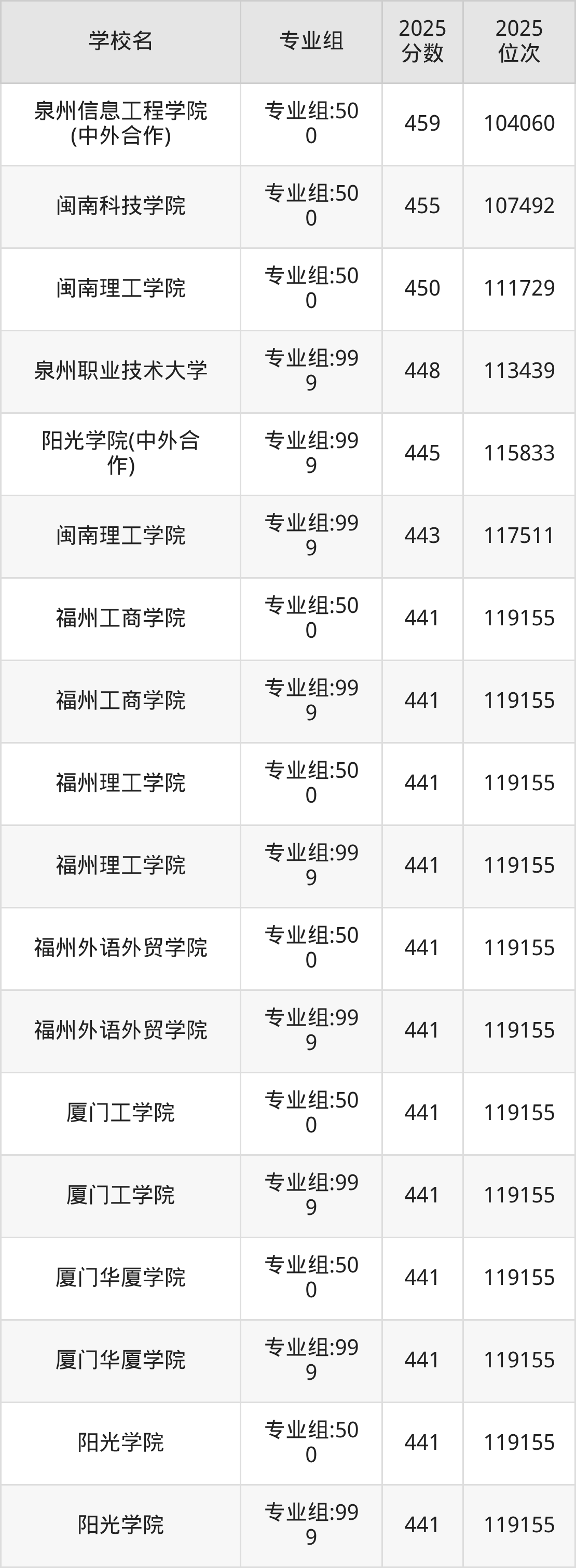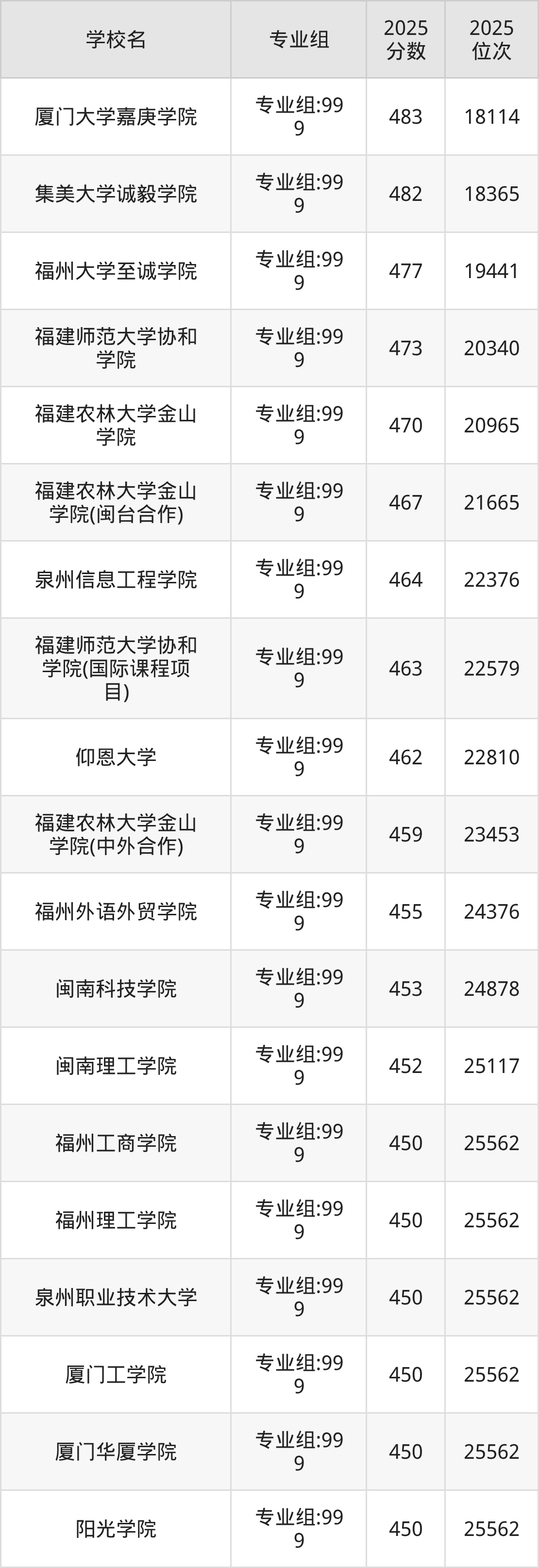 2025年福建历史组招生的民办本科大学专业组共计19个,其中录取分数线最低的为福州工商学院、福州理工学院等,2025年最低分是450分,对应的是专业组:999,位次排名是25562名。收分最高的是厦门大学嘉庚学院,2025年专业组:999最低分是483分,位次排名是18114名。
