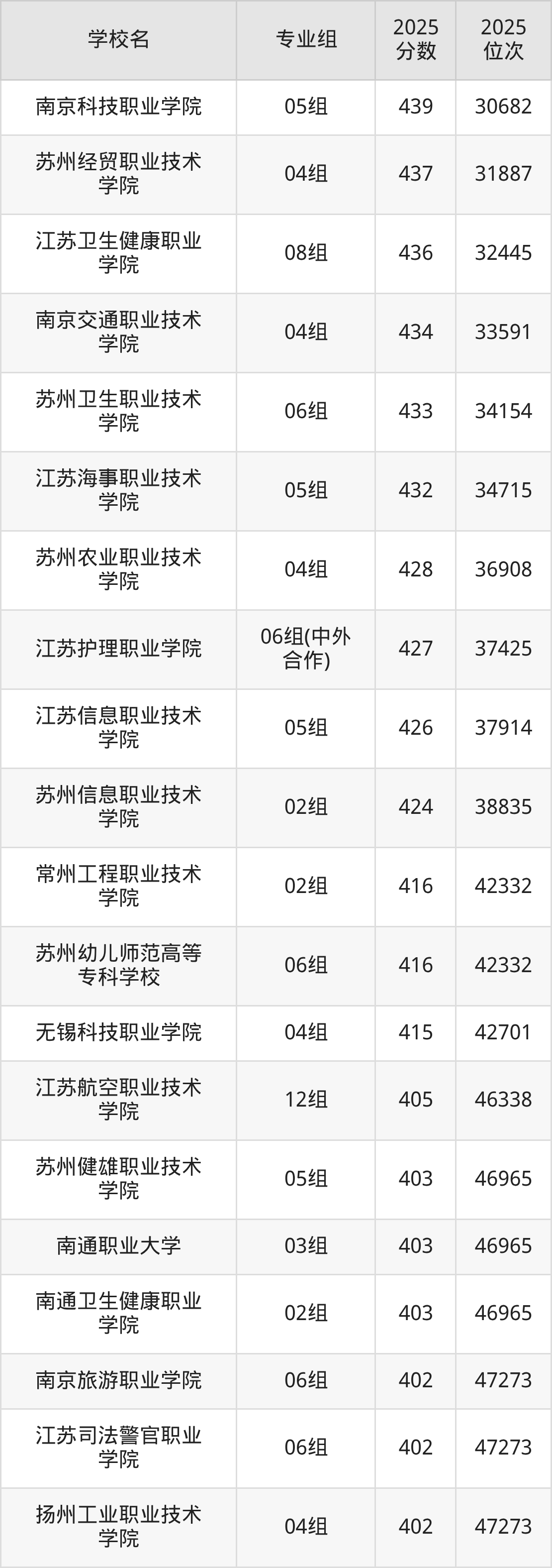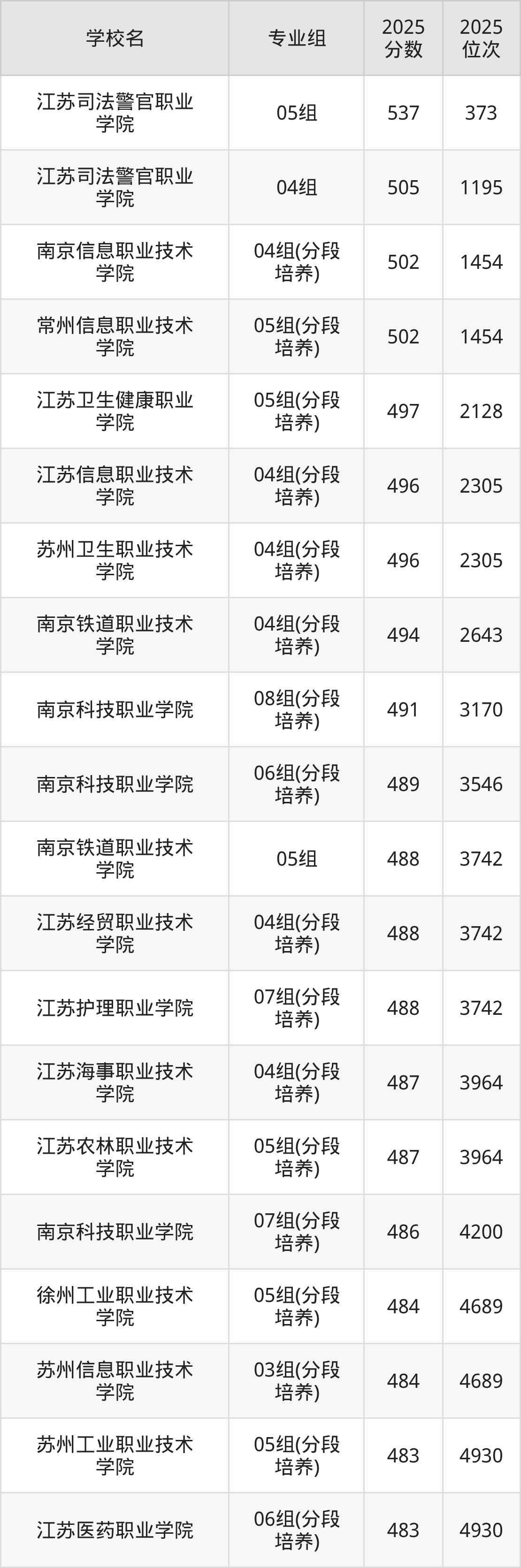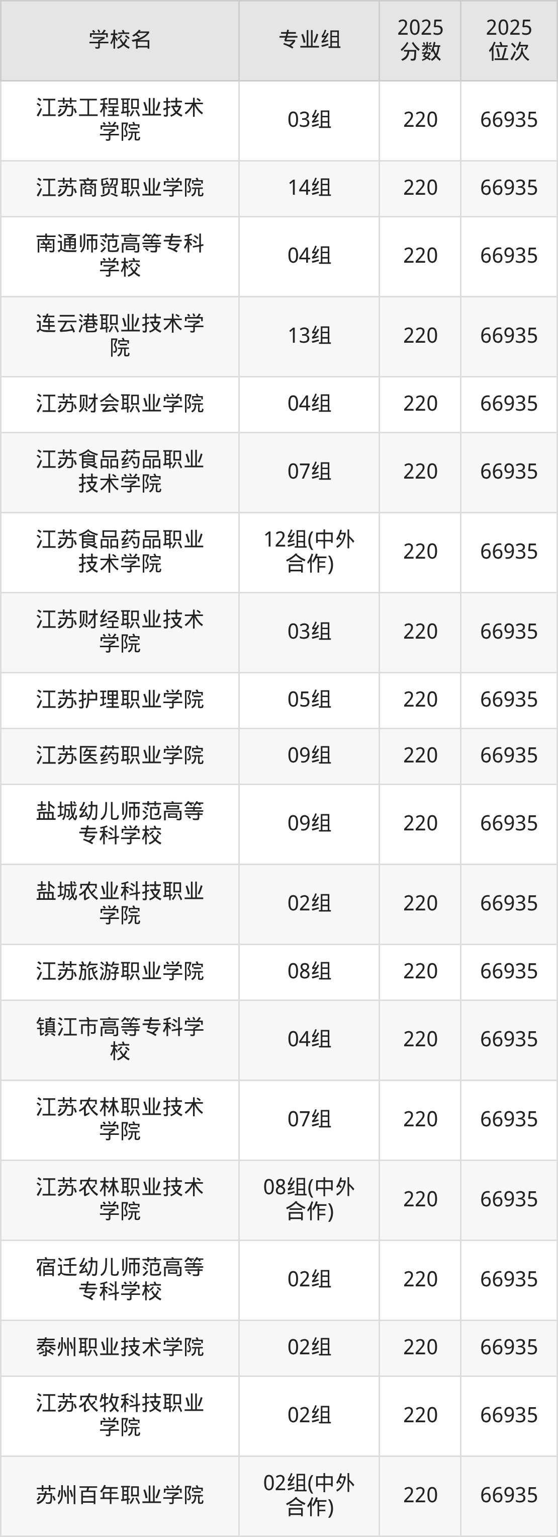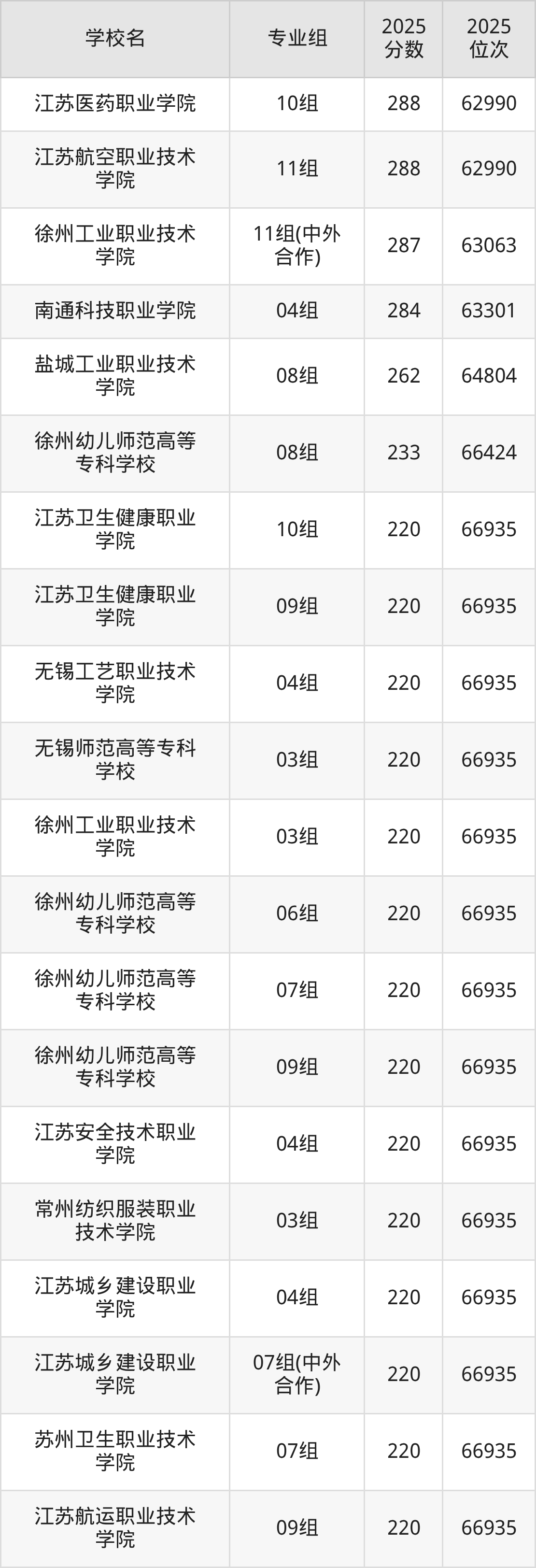 2025年江苏物理组招生的公办大专院校专业组共计220个,其中录取分数线最低的为江苏卫生健康职业学院、无锡工艺职业技术学院等,2025年最低分是220分,对应的是10组、09组等,位次排名是66935名。收分最高的是江苏司法警官职业学院,2025年05组最低分是537分,位次排名是373名。