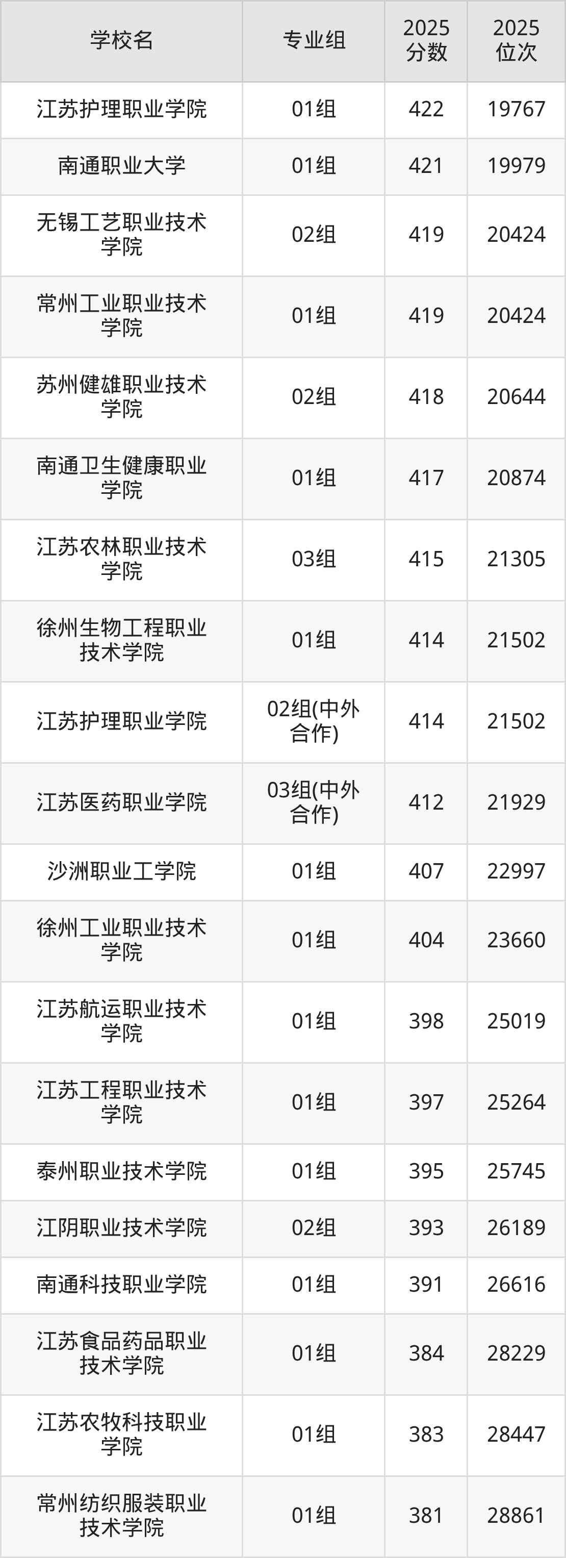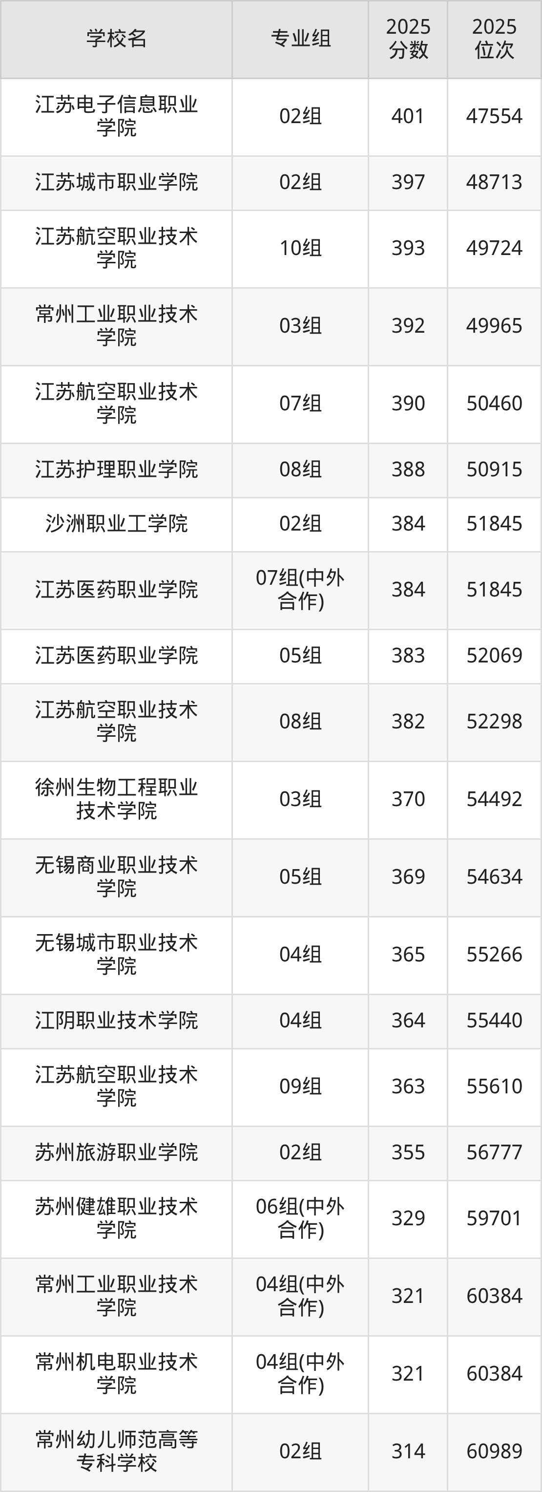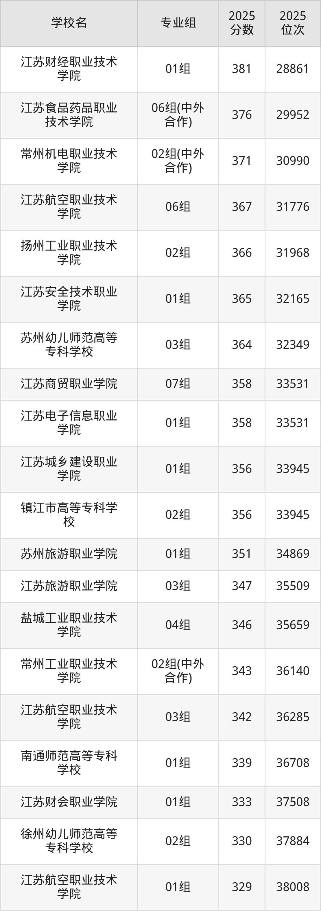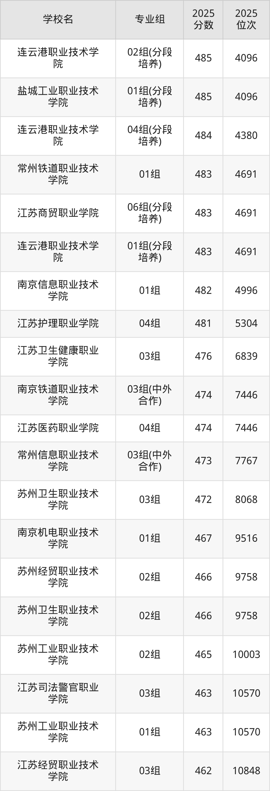 2025年江苏物理组招生的公办大专院校专业组共计220个,其中录取分数线最低的为江苏卫生健康职业学院、无锡工艺职业技术学院等,2025年最低分是220分,对应的是10组、09组等,位次排名是66935名。收分最高的是江苏司法警官职业学院,2025年05组最低分是537分,位次排名是373名。