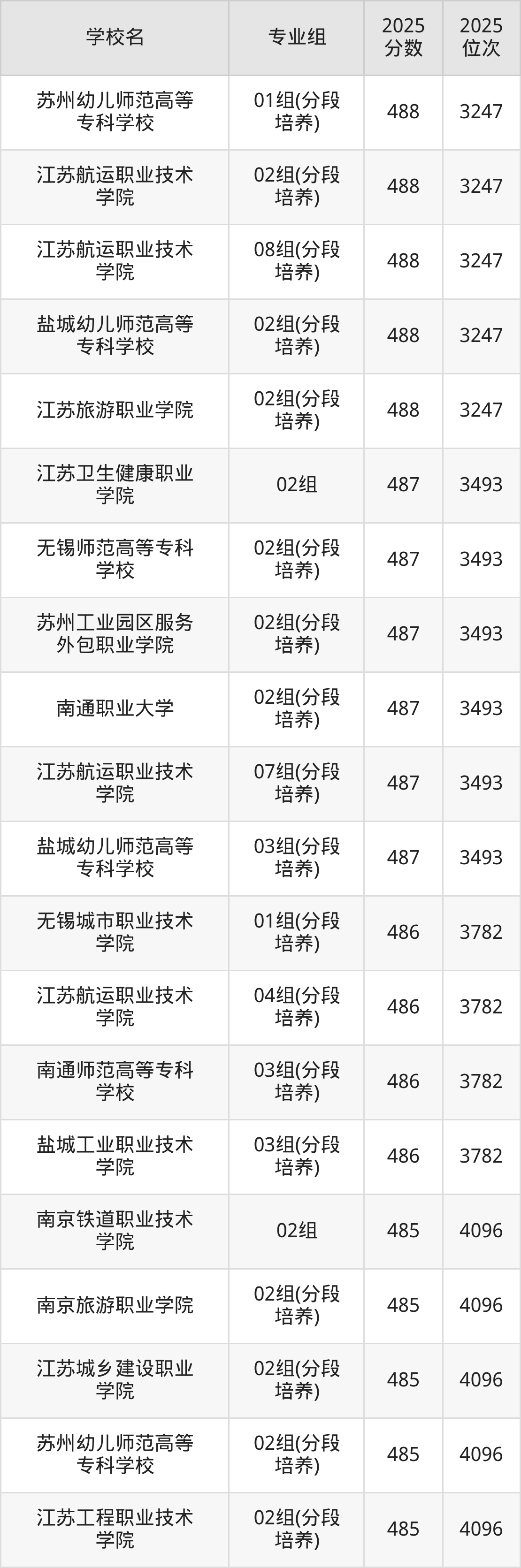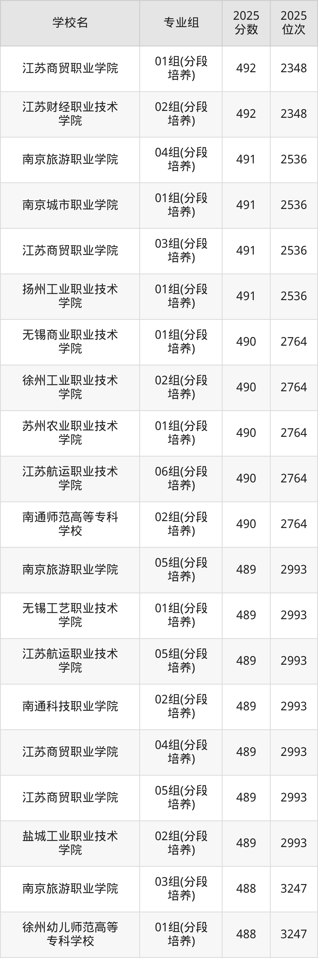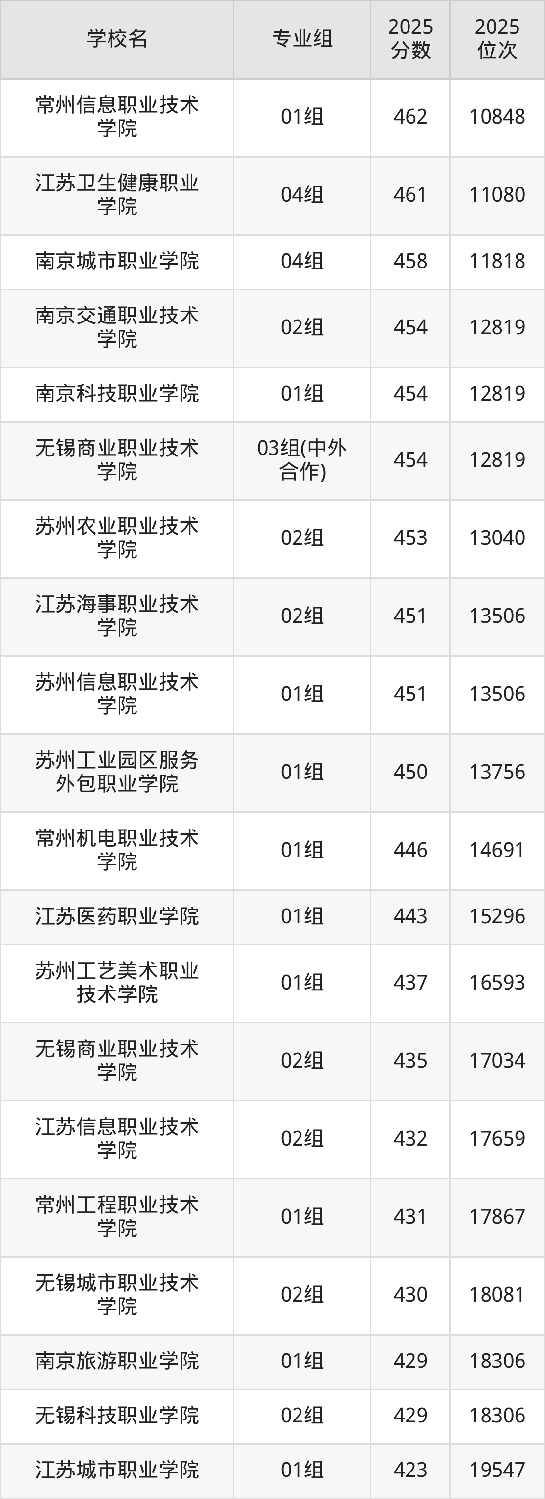 江苏信息职业技术学院:426分到496分,最低分为05组、最高分为04组(分段培养);